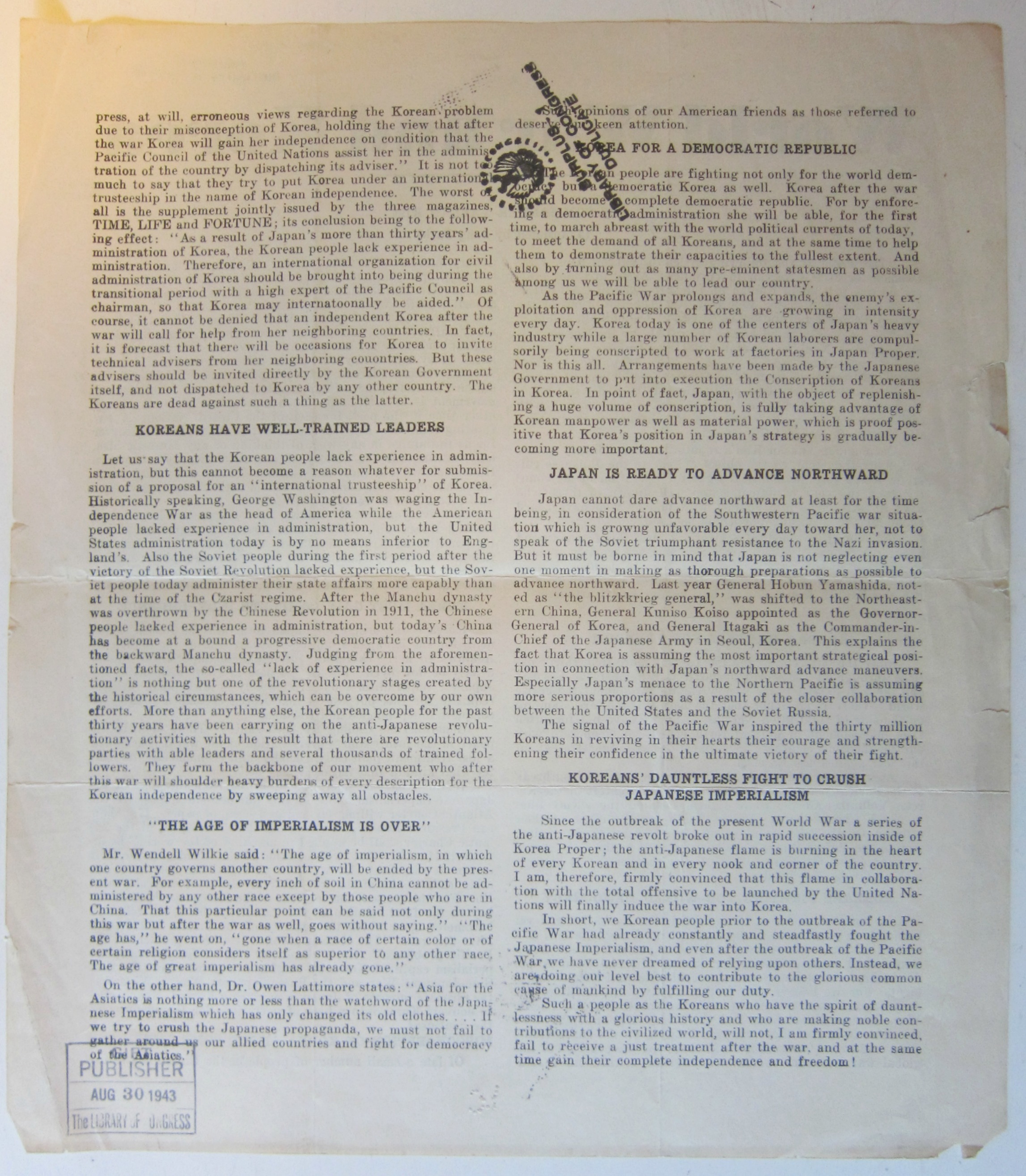 I found this document in a collection of WWII material--it was a surprise, an interesting surprise. World War and Korea was written by Commander Yaksan Kim (Vice Commander of the Korean Independence Army in China) and translated by Sang Park. It is a separately printed document following its publication in the Korean journal The Future (the organ of the Korean People's Revolutionary Party with the Korean Provincial Government) on February 15, 1943. (The document is stamped having been received by the Library of Congress on August 30, 1943.)