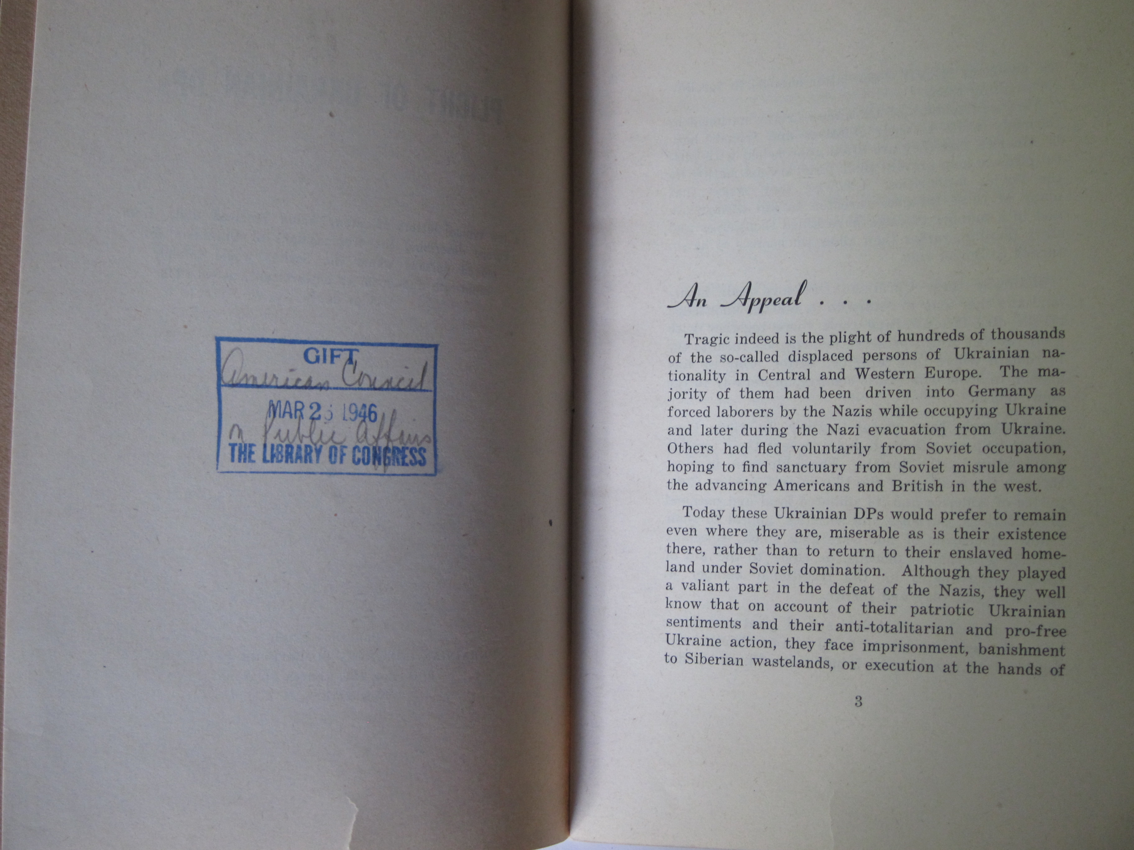 I've reprinted the full text below. (Plight of Ukrainian DPs : a few typical letters of many being received daily from Europe describing the tragic plight of Ukrainian displaced persons whom the Soviets would forcibly repatriate and doom to enslavement, persecution or death, ca. 1945/6, or 1945 according to WorldCat/OCLC.)