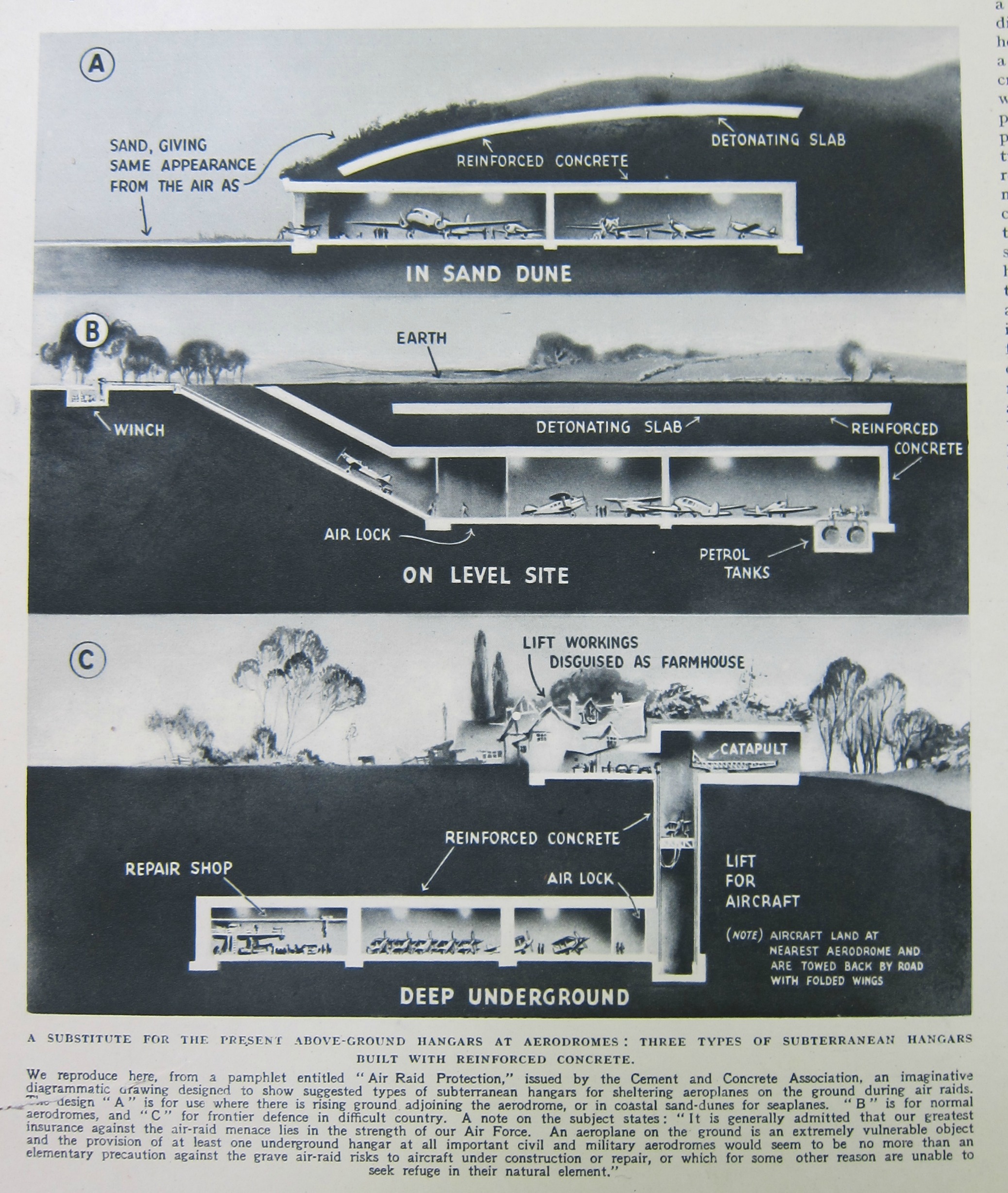 The Cement and Concrete Association of Great Britain had issued several pamphlets in 1938 regarding air raid shelters for the protection of individual families, groups, and cities. In the pages of the Illustrated London News, writer and war correspondent John Langdo-Davies (1897-1971) reviews (or at least shares) the associations plans for underground fortified military airfields, the illustration for which I reproduce below: