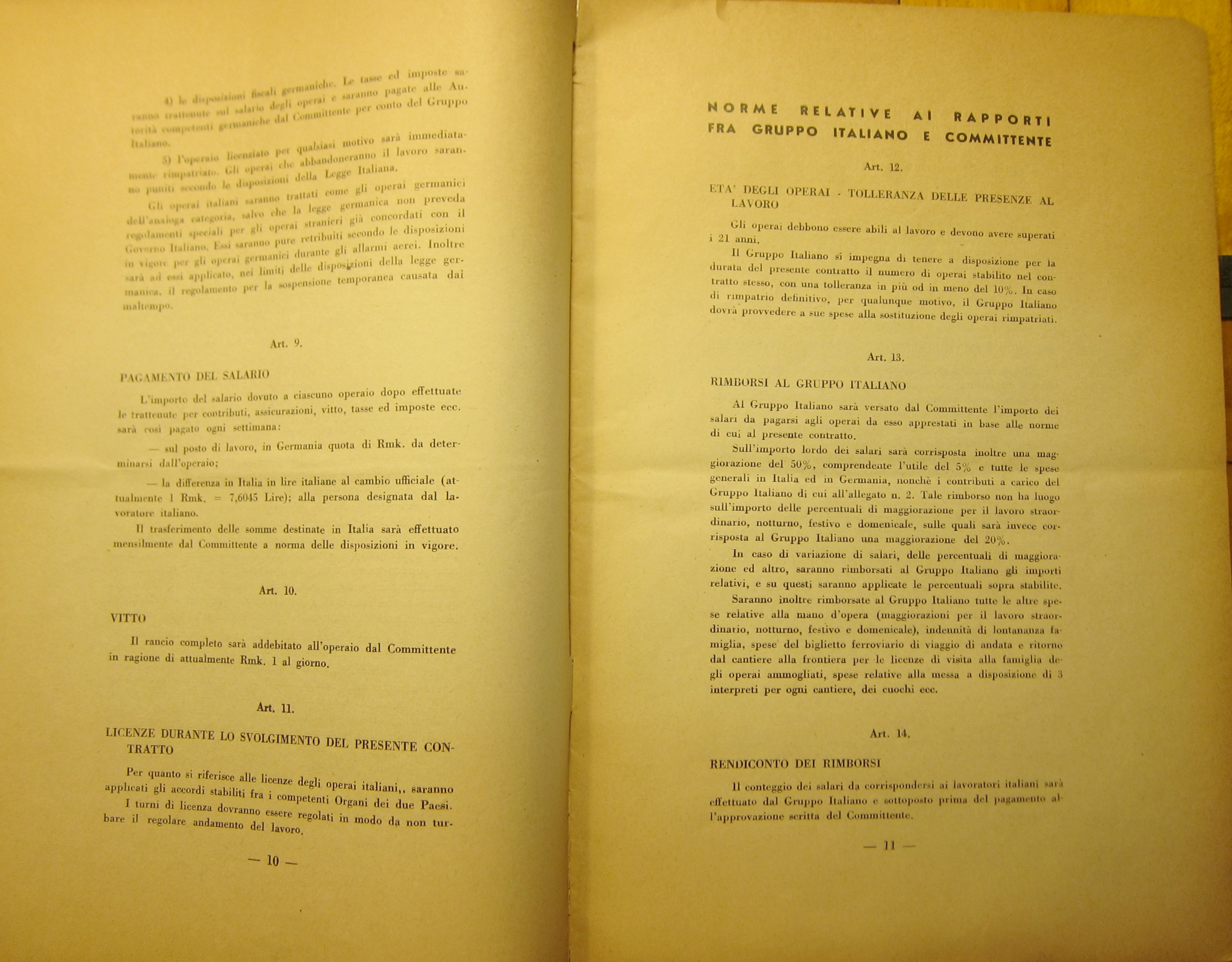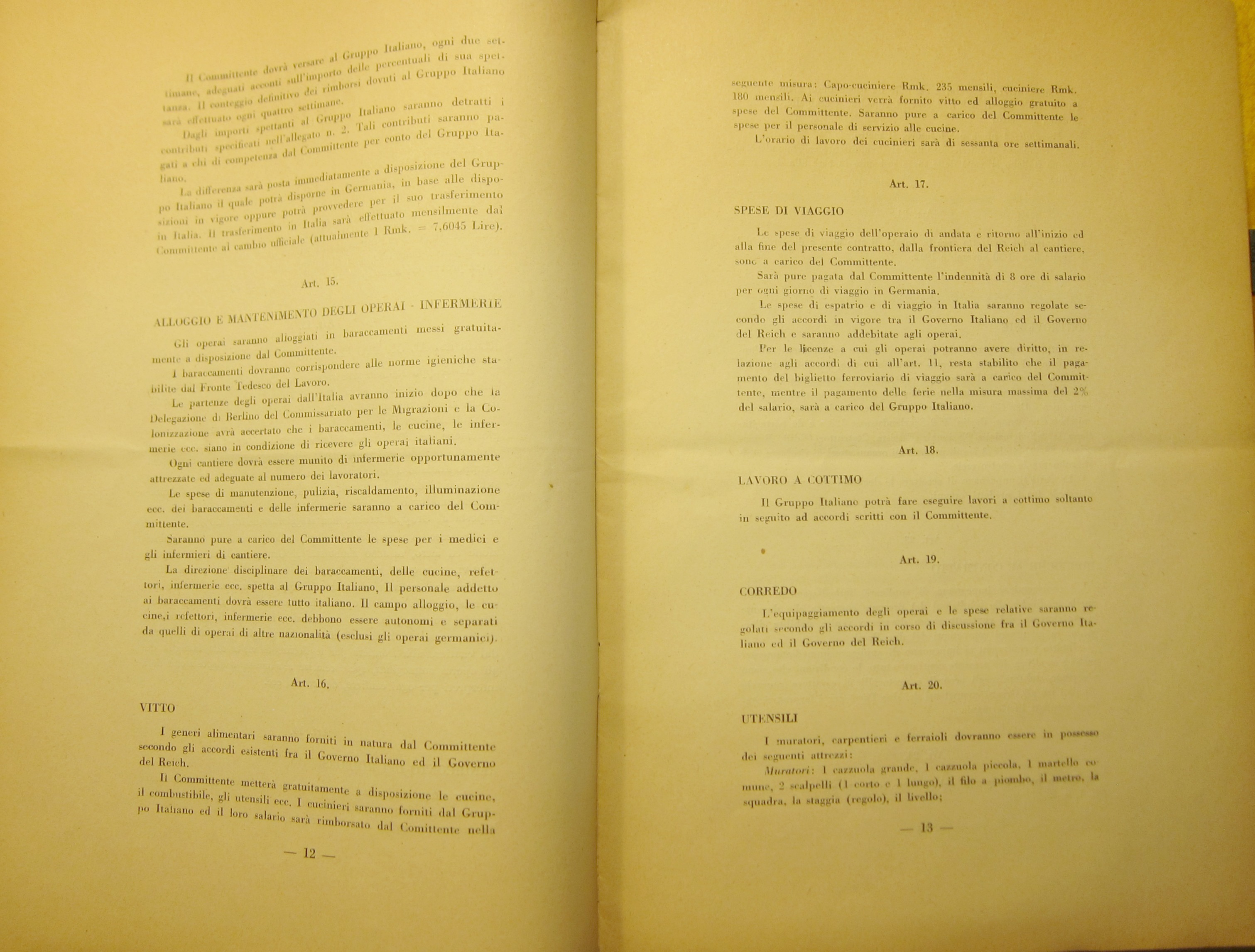 It is a simple, basic document on one of the least simple and basic things of the 20th century. The contract detailed labor expectations, needs and regulations from both the German and laboring Italian sides for the construction of these three concentration and slave labor camps in 1942. Subjects of interest in this document include salaries, housing, vacations, health care and insurance, as well as the application of German laws to the workers, qualifications, and classification of occupations.