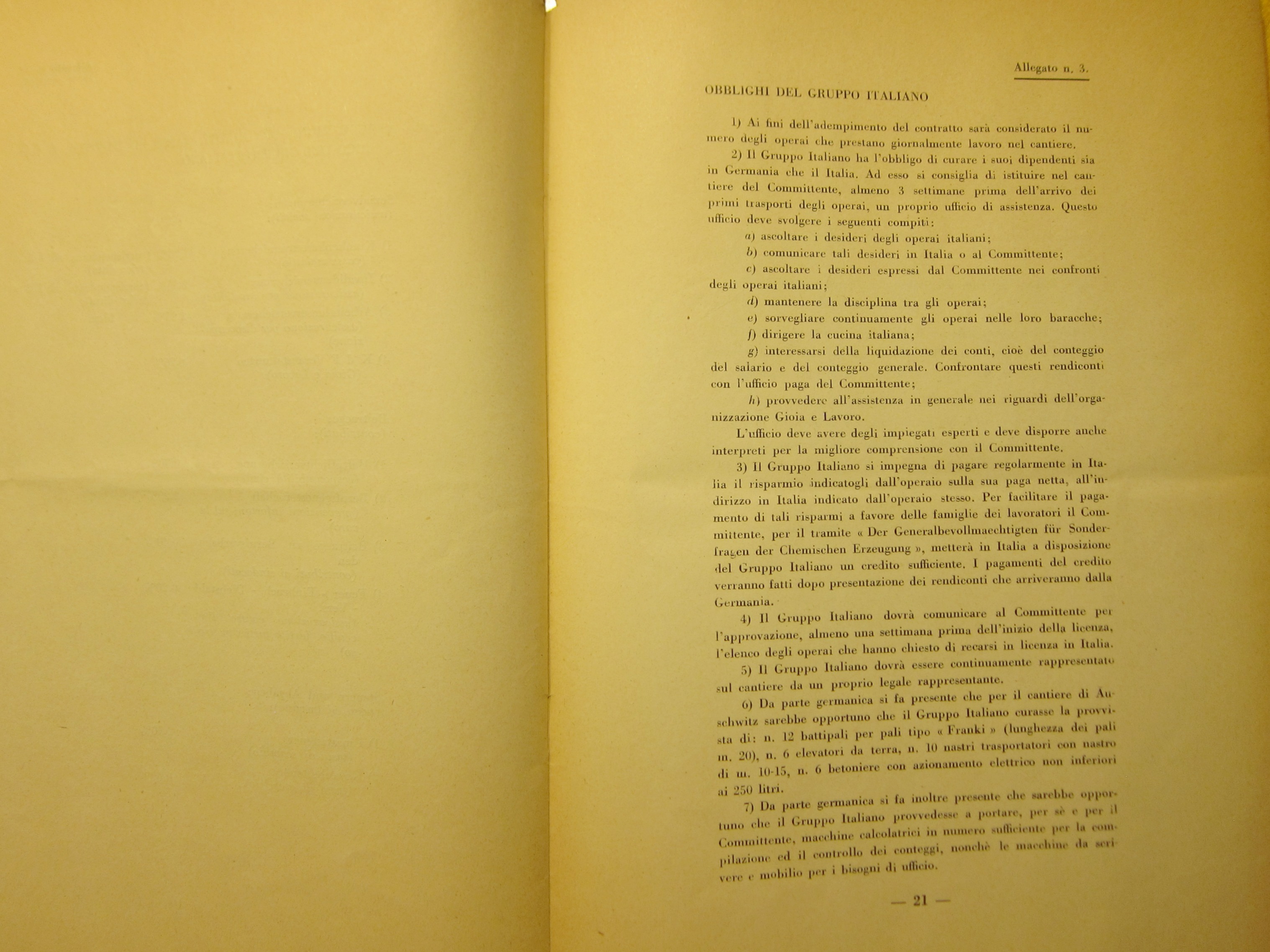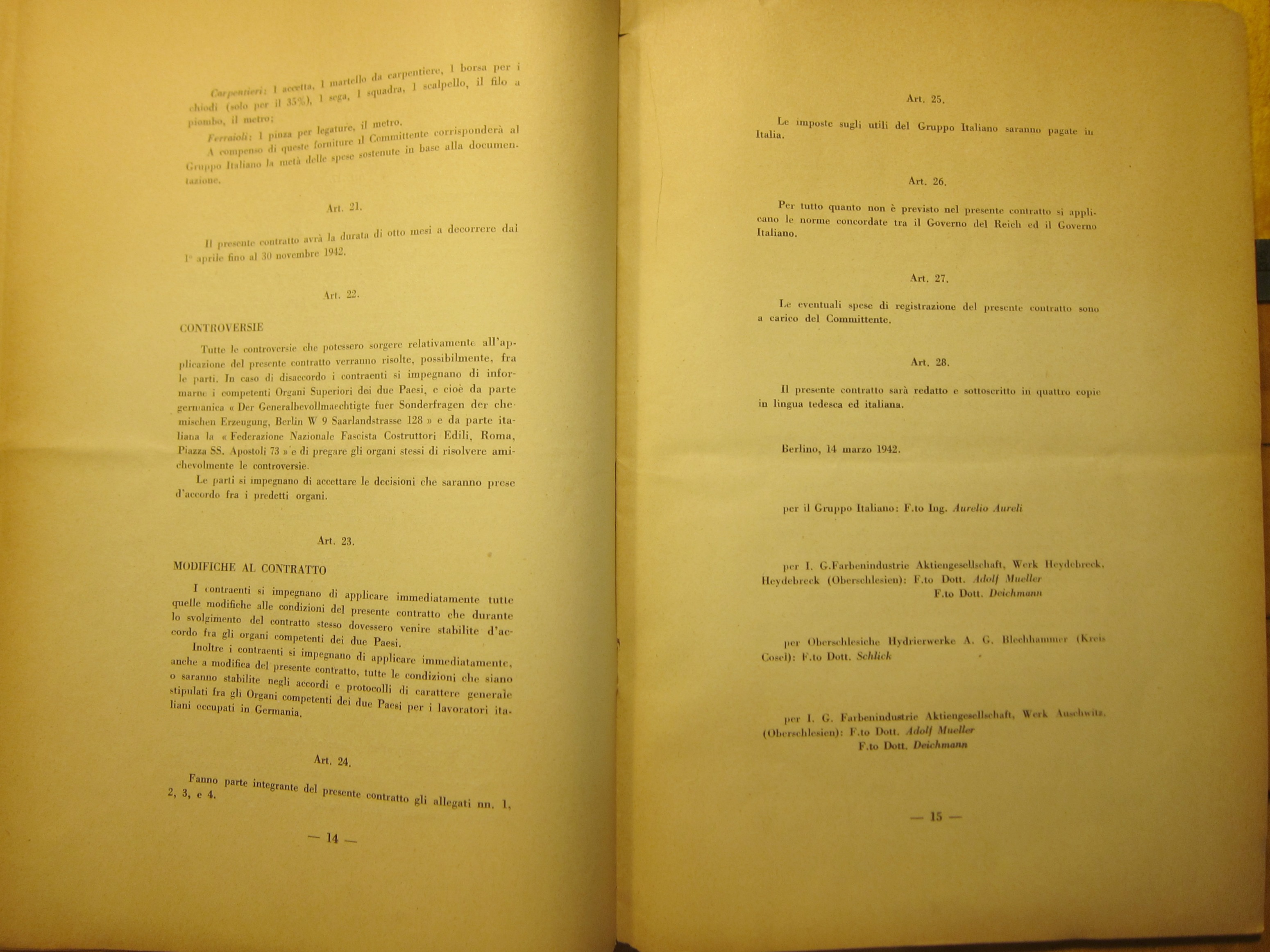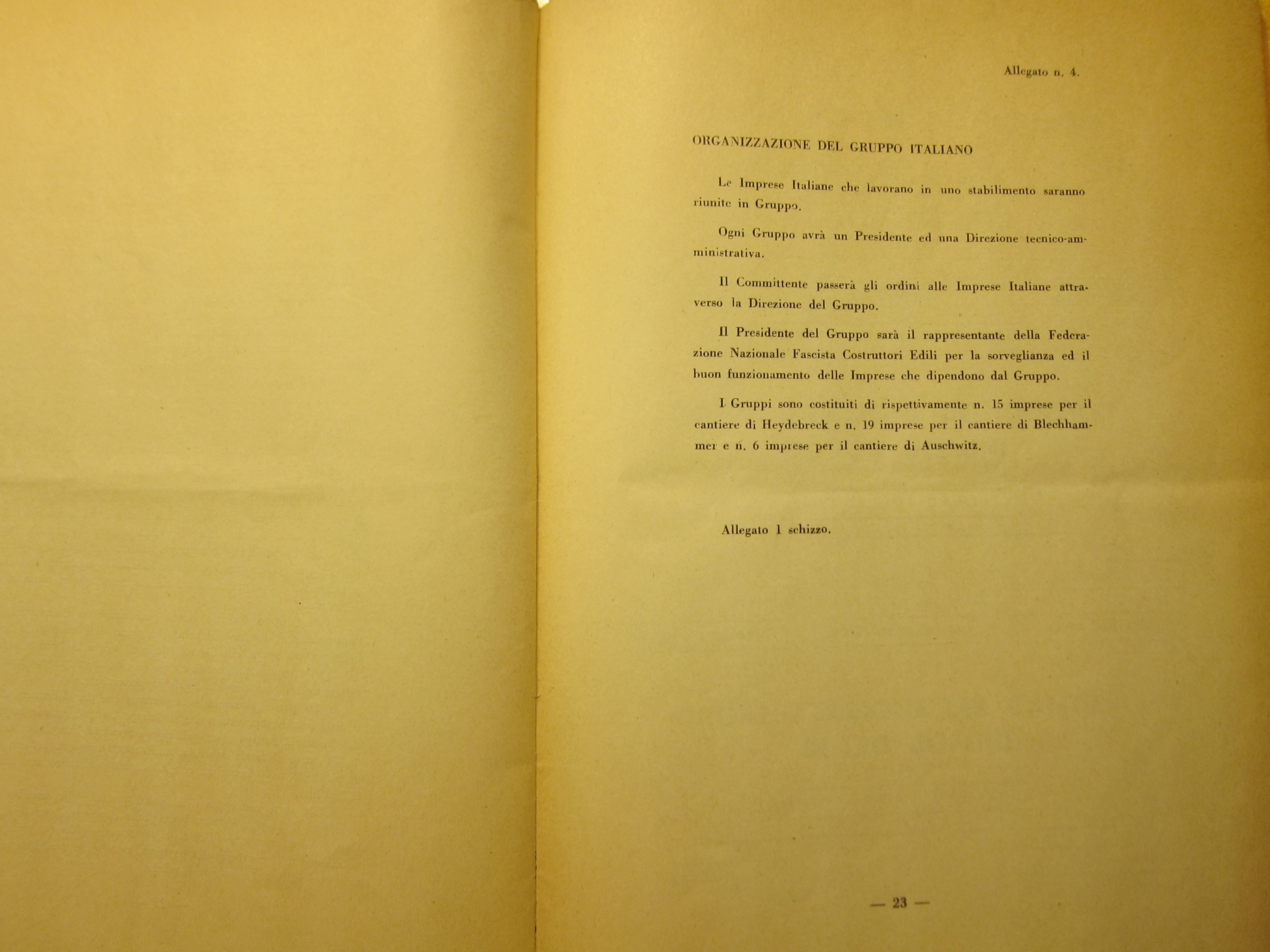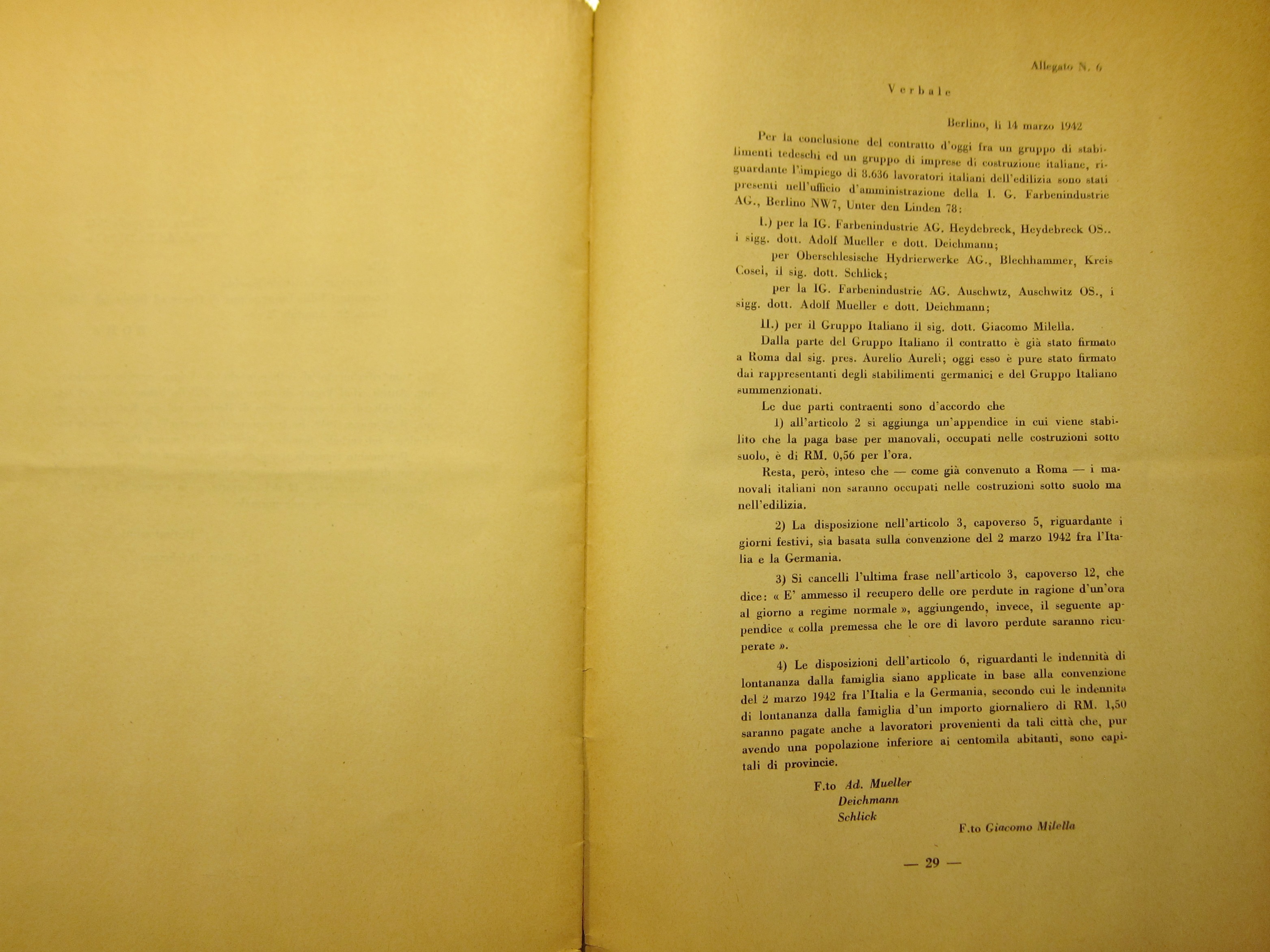 This seemingly innocuous 1942 pamphlet is an outline of agreements for a contract of labor. The people contracting the work is IG Farben, and the laborers are "foreign worker" Italians (represented by the Confederazione Fascista degli Industriali), and the work to be completed is the Buna Works at Auschwitz (part of a vast complex of slave labor, industry, and death, constituted by as many as supporting camps), as well as other work at the forced labor camps at Heydebrek and Blechhammer.