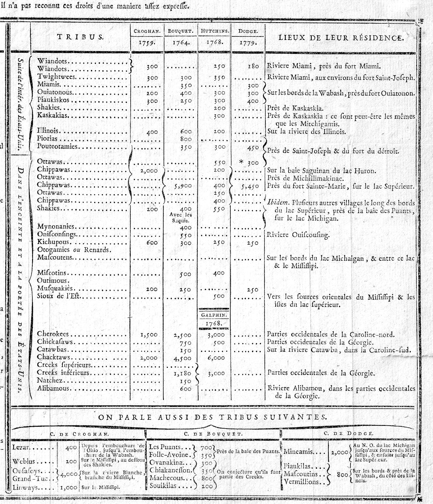 I've decided to simply post this interesting chart without comment--it seems that in my experience I haven't often seen such a long list of tribes with populations at such an early date. Here's the thing, though--I'm not exactly sure of it origin. It is a folding plate from Histoire Universelle, though with this generic title I don't know the author or year, though I guess it to be 1790's (judging by the paper and other clues). As a matter of fact the only hit I get from the interweb on the title of the graphic is for a reproduction of the data over four pages in Jean Nicolas Démeunier's L'Amérique indépendante, ou Les différentes constitutions des treize provinces...though he gives no attribution for his heavily-borrowed stats. The author of this set of stats though, did, with estimates of population numbers from four sources for 1759-1779. So: