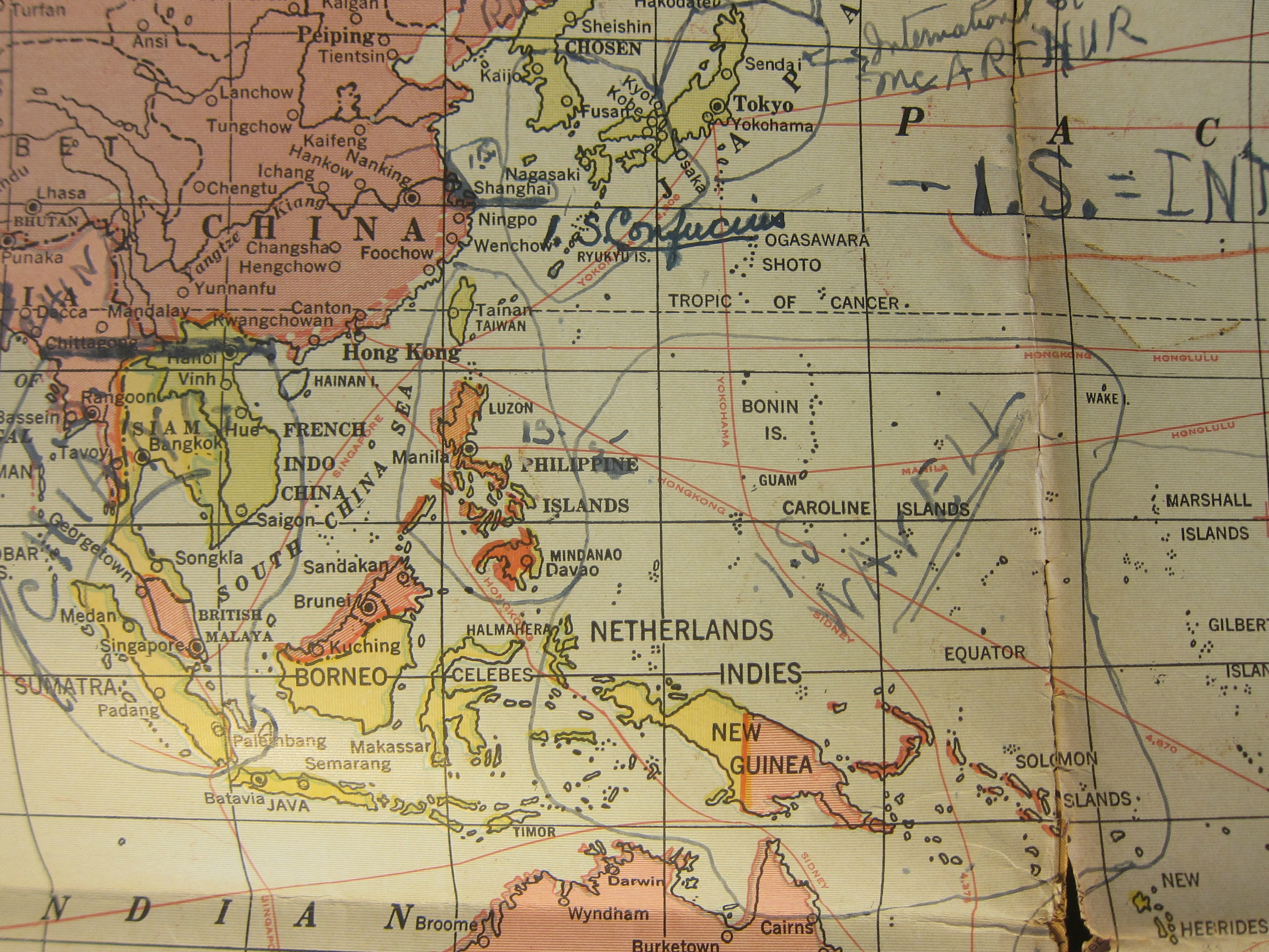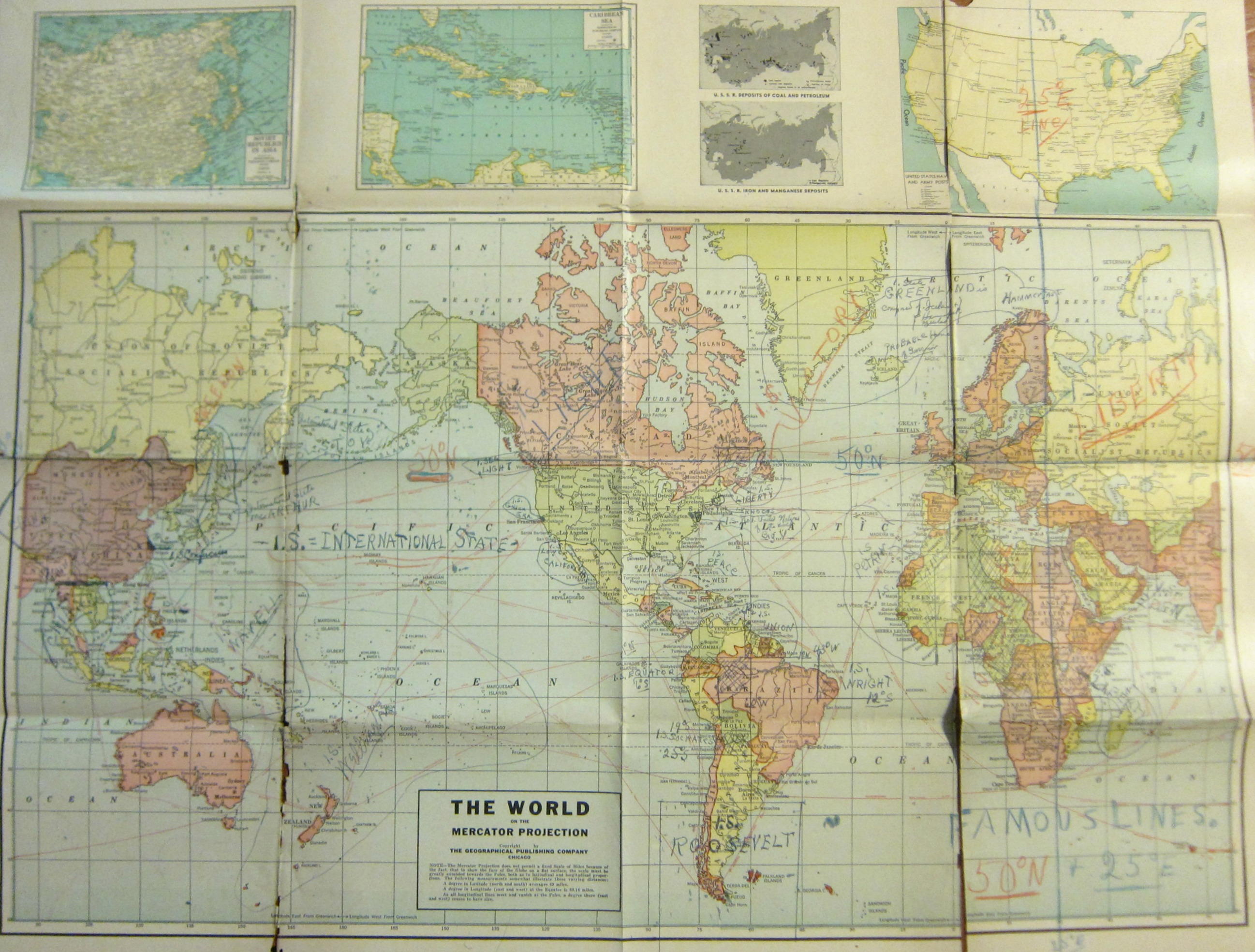 First things first: I cannot find the author's name, though it is doubtful that I would have posted it here, given the amusement park wonderfulness of this foreign policy. The bumpy title of this far-reaching work , United Nations of the World Washington, D.C. U.S.A. January 1, 1942, Started the New World Era Called the Dawn of the Golden Age Which is the Beginning of the End of all World Destructive Forces, should give a bit of a hint to what might follow...at least this is the case for many of the 1000-odd Naive Surreal/Outsider Logic pamphlets in my "collection". The work (11x8.5", 14 printed leaves, 8 maps) was printed on April 25, 1942 (so noted on the last page, along with the manuscript annotation, "Plato"), and made its way here via the Library of Congress. The pamphlet began its journey though at the White House--in the right corner of the pamphlet cover you can see the rubber stamped "Respectfully Referred to the Department of State" followed by [some name], "Secretary to the President". As it turns out that name was Marvin H. McIntyre, who indeed was the secretary to the president. McIntyre has been with Roosevelt since the later's VP campaign in 1920, and then joined FDR at the White House in 1933, when he remained as one of the three secretaries to FDR until he died in 1943. In any event, the author must've sent his idea of re-arranging the world directly to Roosevelt; McIntyre though it better for Roosevelt to not be distracted by this work and no doubt sent it off for the DOS people to deal with. The very faded rubber stamp at bottom seems to indicate that it was received at State in May 1942, which means it made a rocket exit from the WH. Then either something or nothing happened until it was sent to the Library of Congress in 1947.
