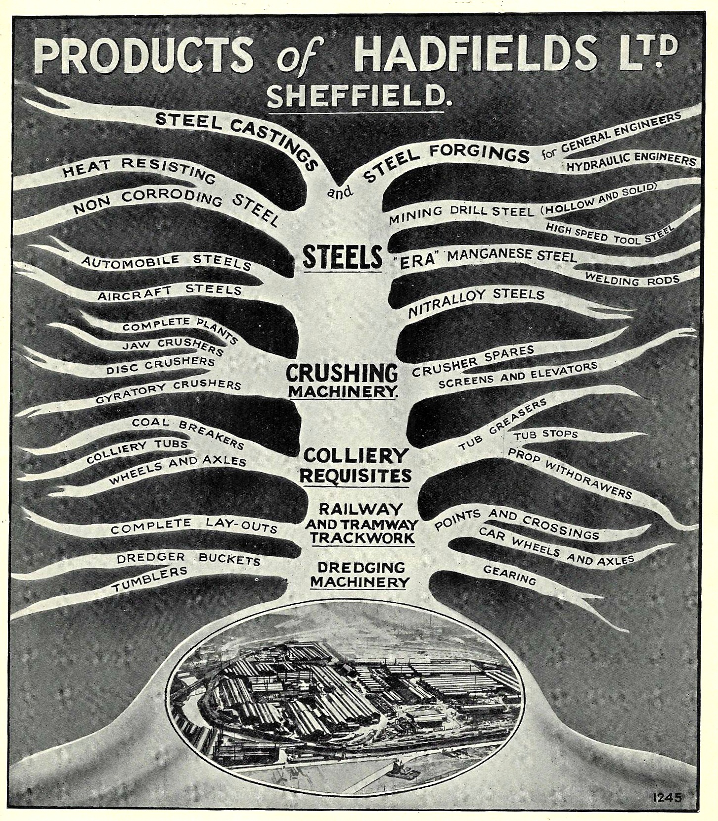 This evening's sample comes from a heavy and slick publication for "Sheffield Week", showcasing producers in that city and surrounding area, and printed about 1935. There are many ads from manufacturers and sellers, and this example is one of them. Hadfields Ltd., which produced a lot of heavy goods, many of the genres of which are the heavy limbs of this heavy tree: