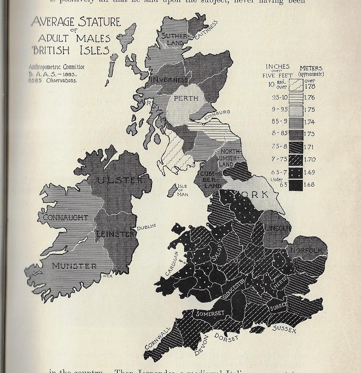 I must say that I've never seen a map of "Relative Brunetness" before finding this one, today. It occurs in a little bit of a wincing article by William Ripley (Ph.D., and assistant prof of sociology at (surprisingly) M.I.T) called "The Racial Geography of Europe", and appearing in Appleton's Popular Science Monthly for December 1897. Here we see the "Index of Nigrescence", which I take is a measure of blackness of the hair (in this case), with light to dark meaning, well, light-to-dark measures of hair, this taken from 13,000 observations. A few pages away comes a map of the stature of adult males in the British Isles, locating the averages between the gross average of 5'6.5" to 5'10" and over.