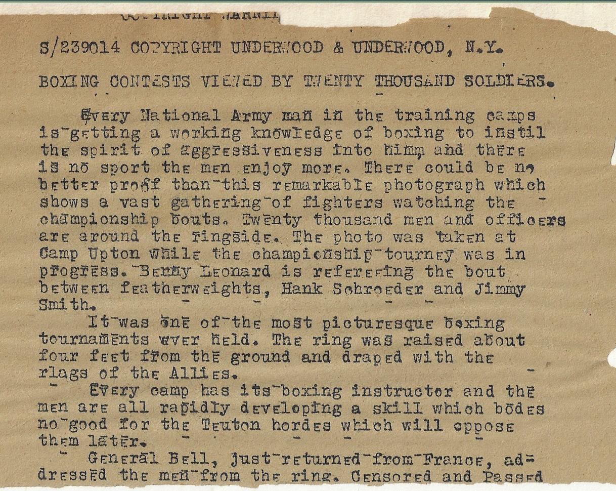 I've posted probably 100+ images from a stash of WWI News Photo Service photographs that I have here (you can find some of them by clicking on the WWI Photos link at the top of each page, located just under the blog's banner, and read about the photo services) and the one I'm hosting today is one of the few sport-centric images in the 550 item collection. This is a "championship" bout being held at Camp Upton (Long Island, NY) in ca. late 1917/early 1918. The photos usually came with a typed description of the event that was used for a caption by the newspaper or magazine that published it, and this one (reproduced below) describes the scene. I've tried to enlarge some of the areas of interest in the image, but the original isn't sharp enough to allow for more than about 250% increase. But that is good enough to give the viewer a sense of the density of the crowd, and the makeshift atmosphere surrounding the event.