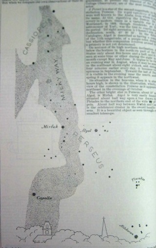 Here we have another example of Found-Art in a scientific paper--this one looking Duchampian (again, especially if it were spiraling), or perhaps Dadaist, or Futurist. In actuality it is something both "harder and simpler if you think about it) (referencing not-Duchamp) and "harder but simpler if you don't think about it" (referencing not-Yogi Berra): it is an article meant for the general masses of pop science reading in the Scientific American Supplement for September 11, 1886 and it is trying to make sense of the famous and mysterious behavior of the star Algol. This is star B Persei, in Perseus, the constellation's second brightest star, and as it would turn out it is an eclipsing binary star. The image below tries to make sense of the behavior of the star--the observation of which was published in 1671 (though the true first accounts may well be ancient.) The variability of the star would only be confirmed 60 years later, and then 50 years later until the remarkable John Goodricke determined the periodicity of the star.