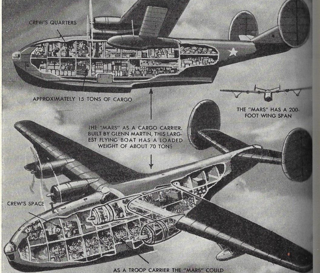 Here are three fine cutaways from my favorite cutaway artist, George Davis. (He has appeared many times on this blog--just have a peek by entering his name in the Google search for the blog and you'll have a number of hits.) These three appeared in a volume of Popular Mechanics for the first half of 1943 and feature comparisons for the cargo aircraft "Mars" (from Glenn Martin), a review of a captured F.W.-190, and a think-piece on a possible cruiser-carrier.