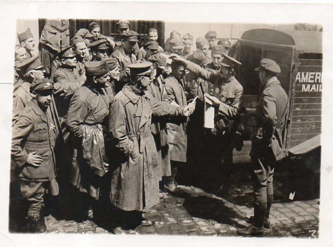Yes, this was undoubtedly a posed shot to some degree, but these U.S. soldiers were still very serious about getting their mail. This is a new photo service image made by a pool of photographers whose work was passed by a censor before being distributed1. The photo was made in the closing weeks of the War in 1918. On the back of the photo is stamped: "What a letter from home means in France/Group of American Red Cross chauffeurs in Paris at mail distribution at their garage", and "Bureau Publicity Lake Div. American Red Cross, for release October 2".