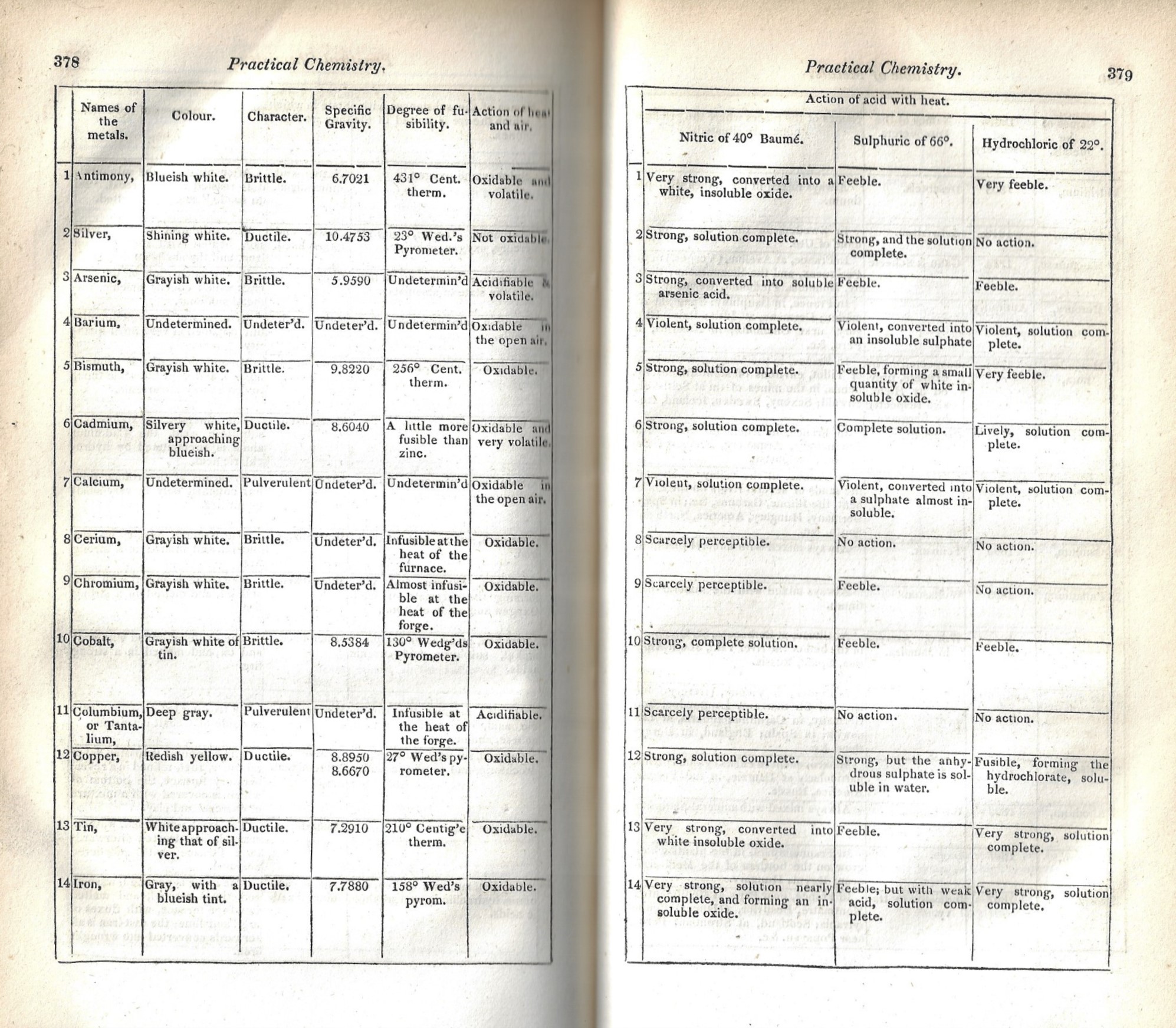Franklin Peale, “Table of Properties &c., of the Metals, taken from a table by M. Chaudet of the Paris Mint”, pp 375-385. This is basically a tabular report on 34 metals, listed alphabetically, and including dates of discovery and the names of discoverers, plus the names and locations of the principle mines, plus color, character, stability, specific gravity, state in which the metals are found, and several other properties. Journal of the Franklin Institute, Philadelphia, 1836; volume 17 (new series) and volume 21 overall, with text illustrations and four plates, 440 pp