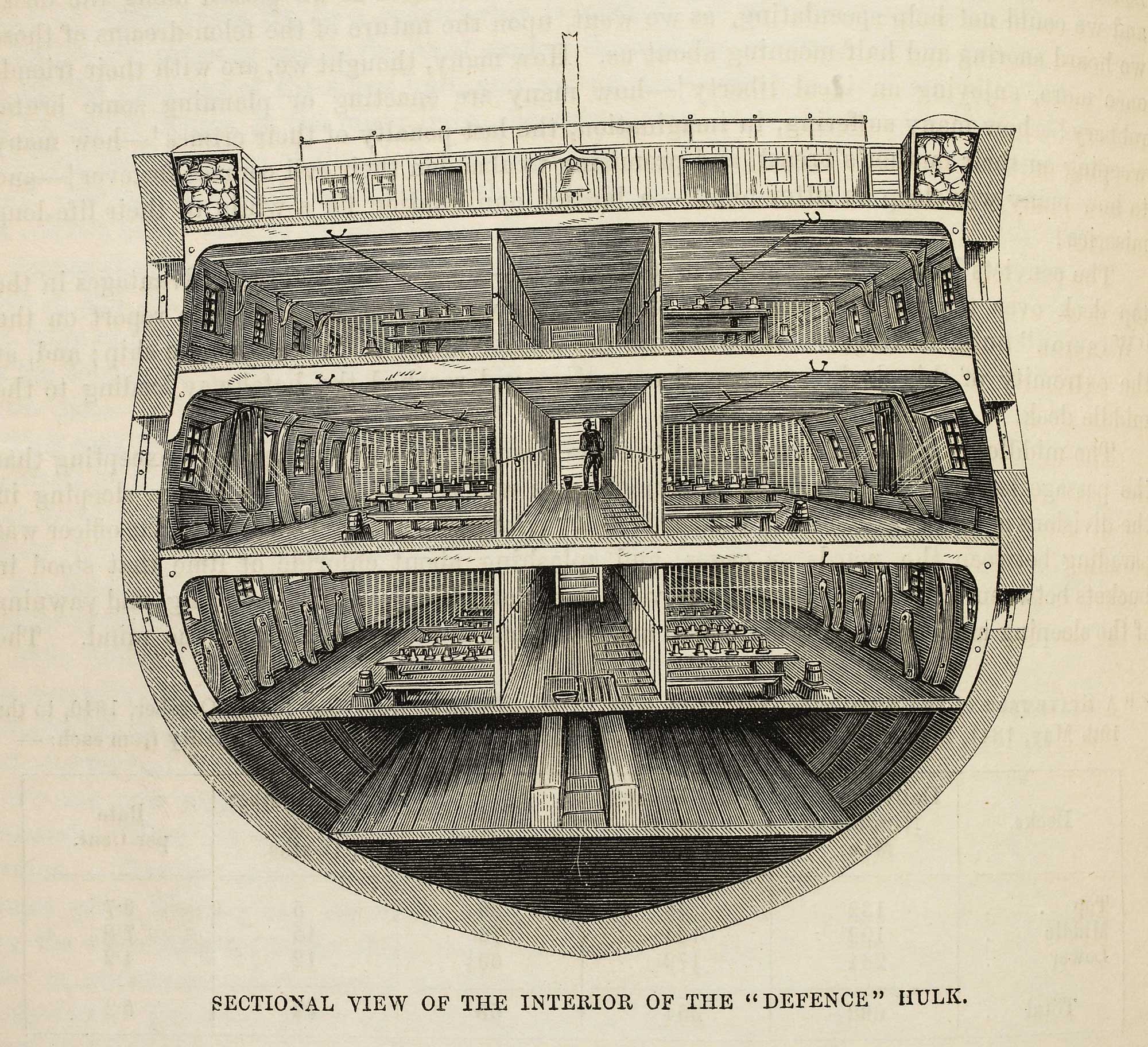 2. Even though the following reference is from much later than the narrative above, the image does give a good idea of one of the "hulks"--it appears in Henry Mayhew's The Criminal Prisons of London, printed in 1862. It is found on the British Library site, along with a three-minute reading of what life was like in the hulk, which was a decommissioned ship, stripped down, and made to hold x-number of prisoners. Comfort was not a concern.