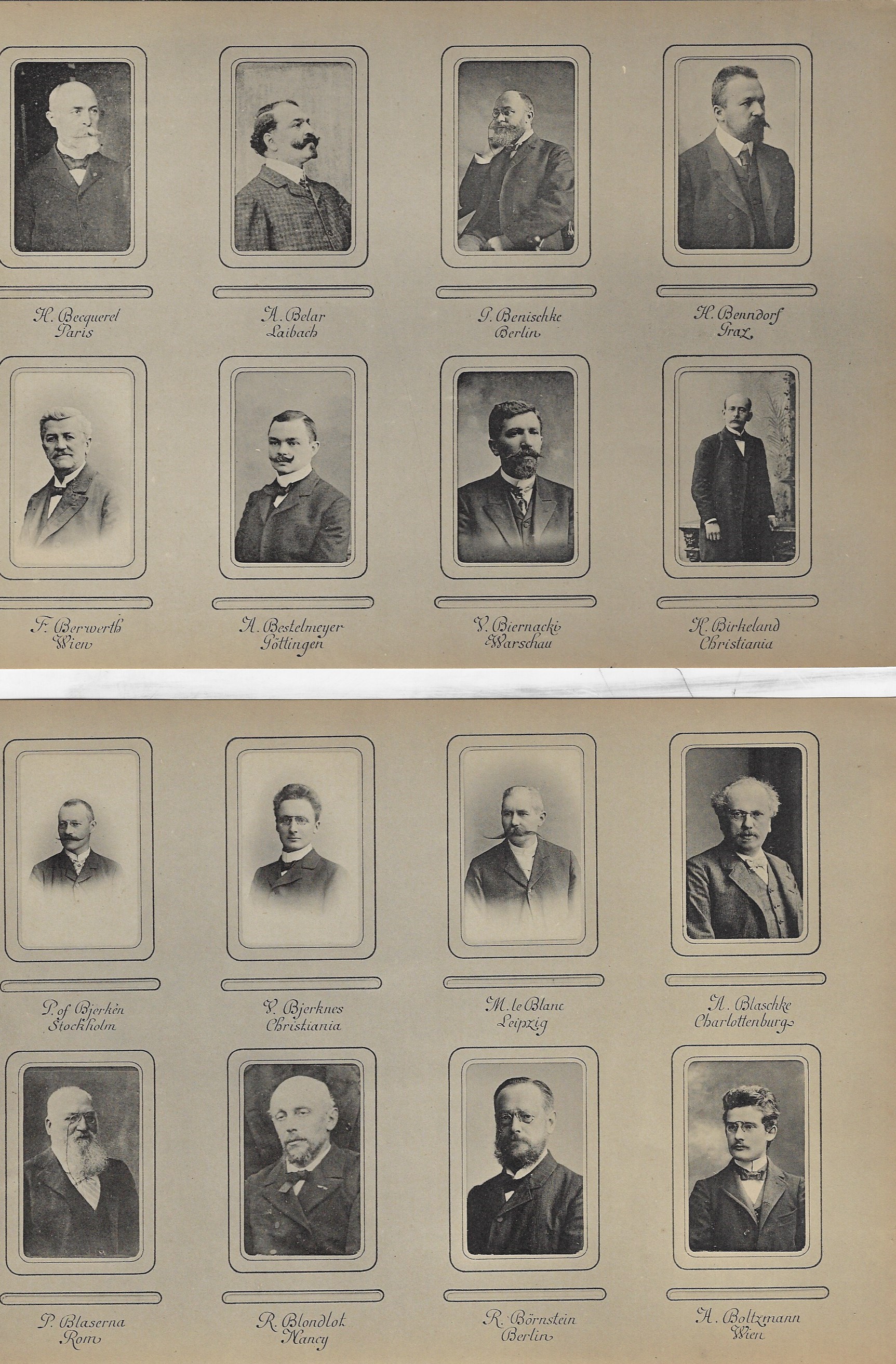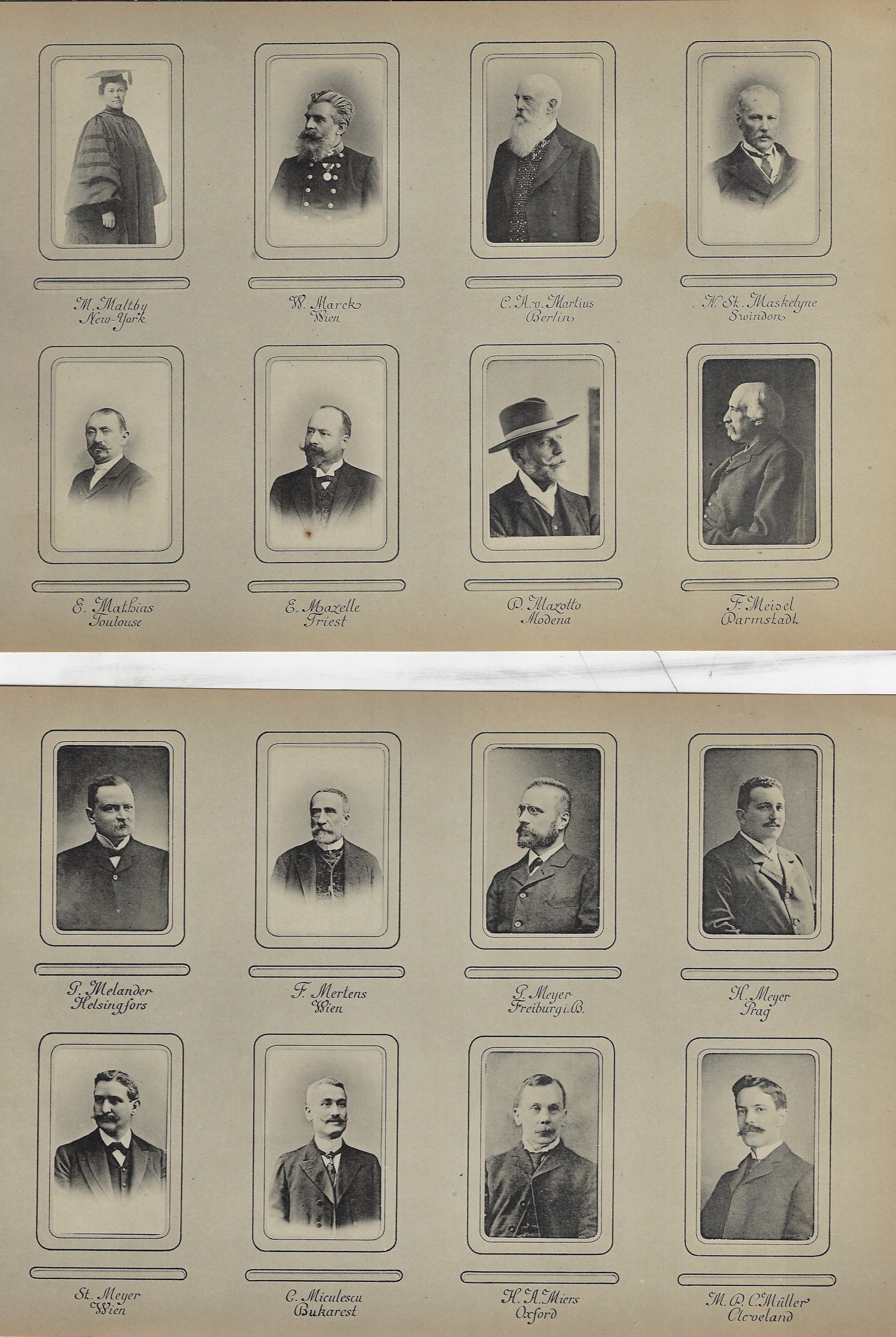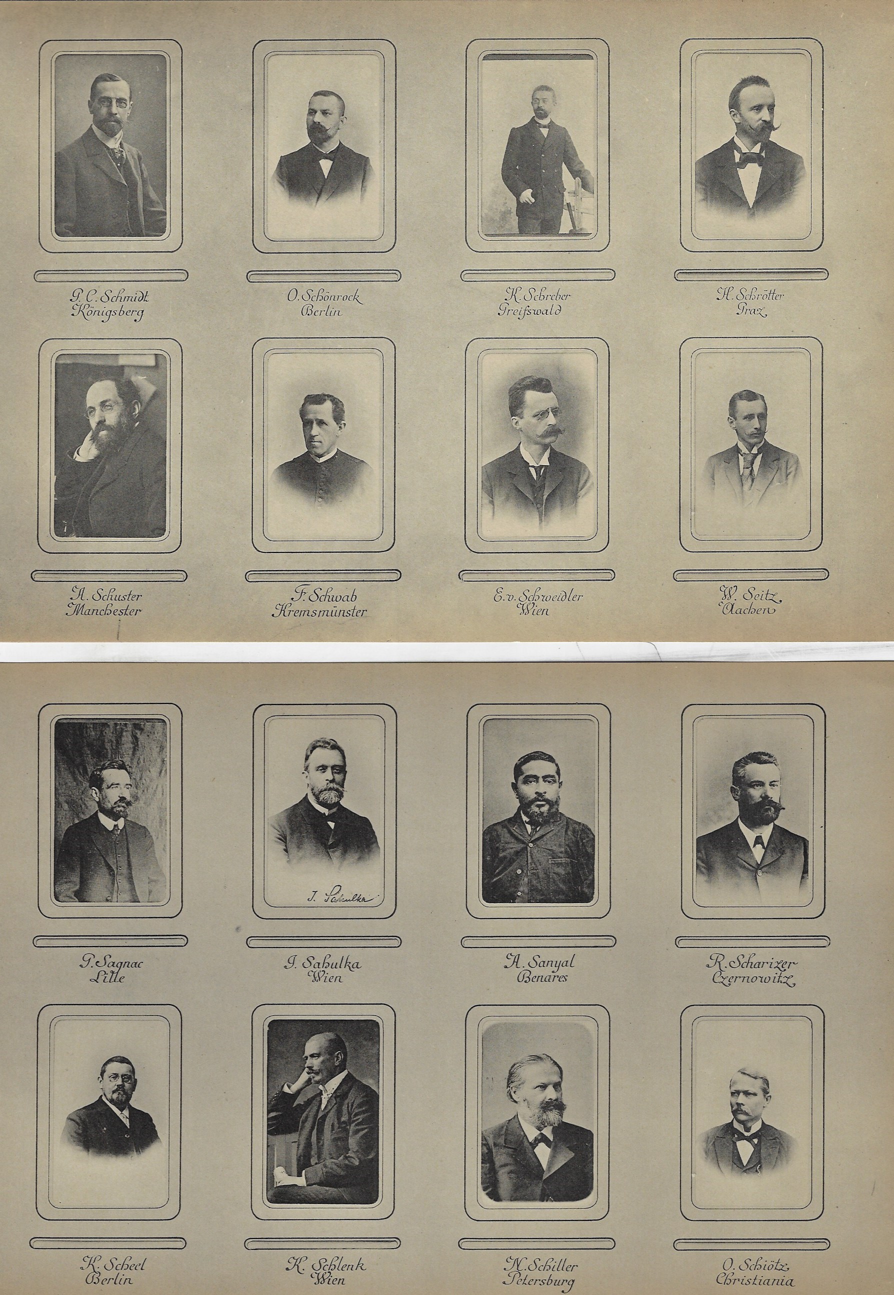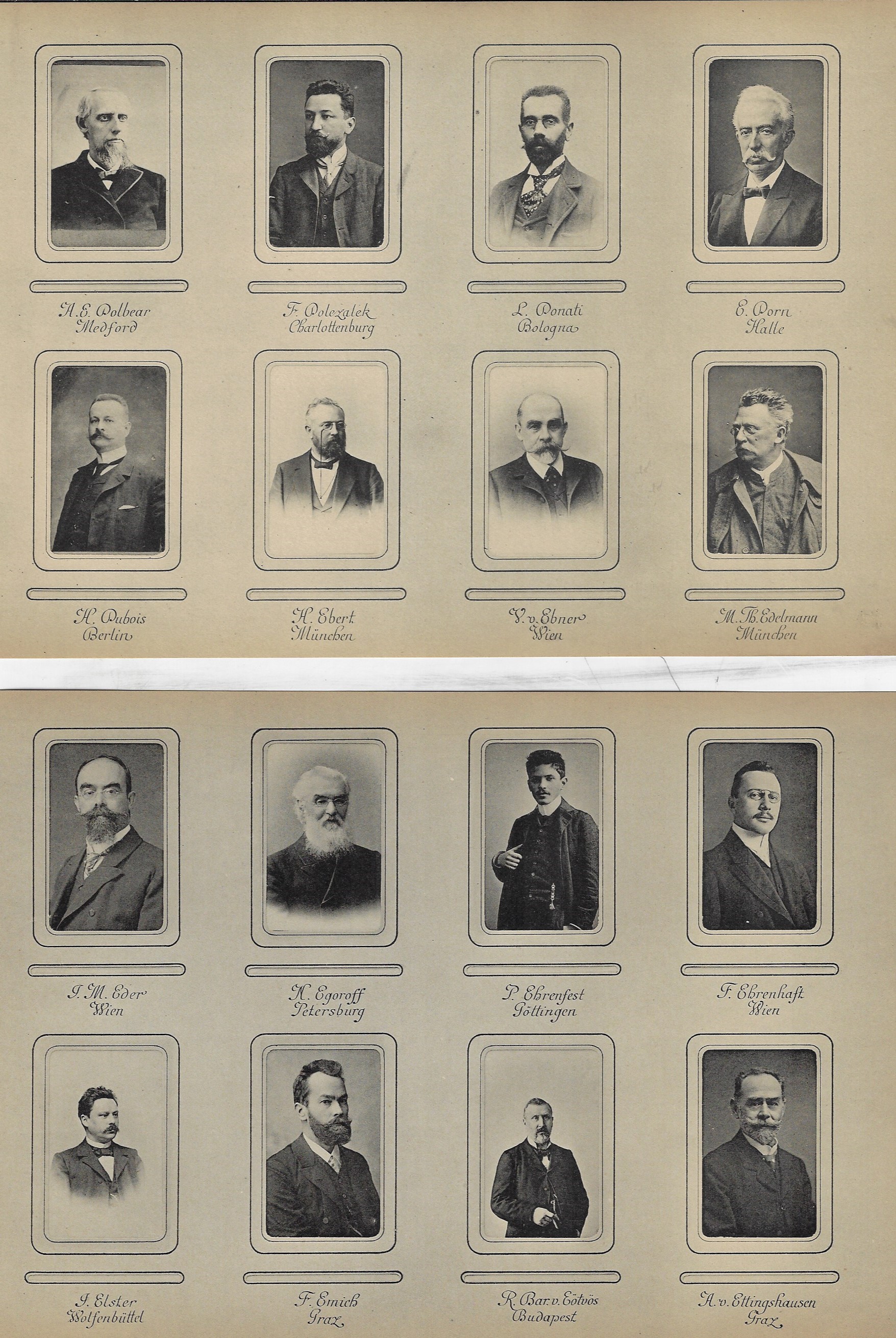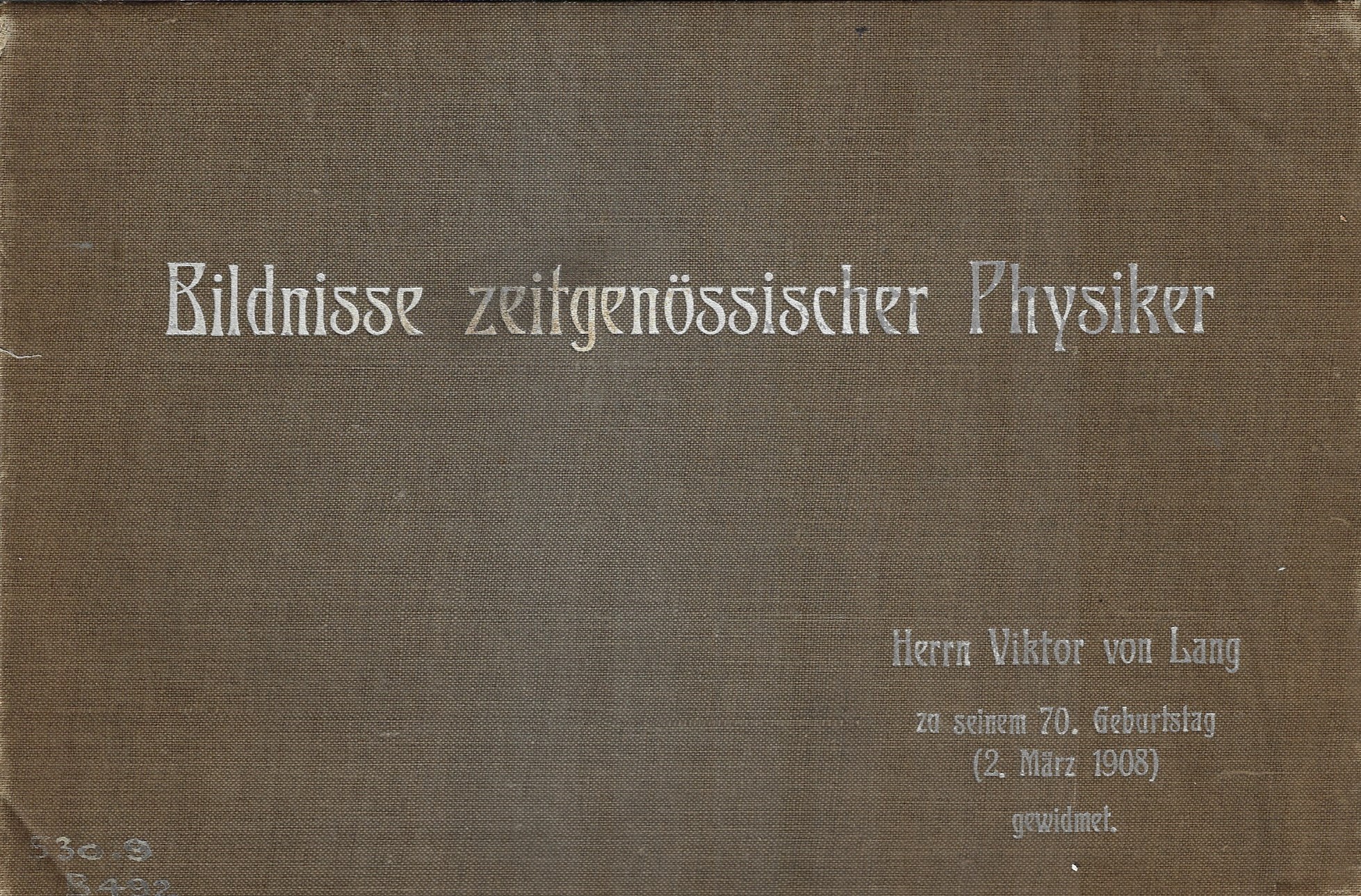 This scarce publication--Bildnisse zeitgennossischer Physiker--is a collection of about 320 portraits of leading physicists, collected together as an homage to Viktor von Lang on the occasion of his 70th birthday. The book was made to look like a family portrait album, resembling stiff cardboard pages that would have open places in the pages for a collection of cartes des visites to be slid into place via at slot at the bottom of the window. The physicist are from Germany, France, the UK, Spain, the U.S., Russia, Czechoslovakia, Poland, Italy, Hungary, Japan, and a few other countries. Interesting to note here are the three portraits of women physicists: Margaret Maltby (Barnard, and first woman to receive a doctorate from a German university); A. Serdobinskaja (St. Petersburg); and O. Steindler (Vienna).