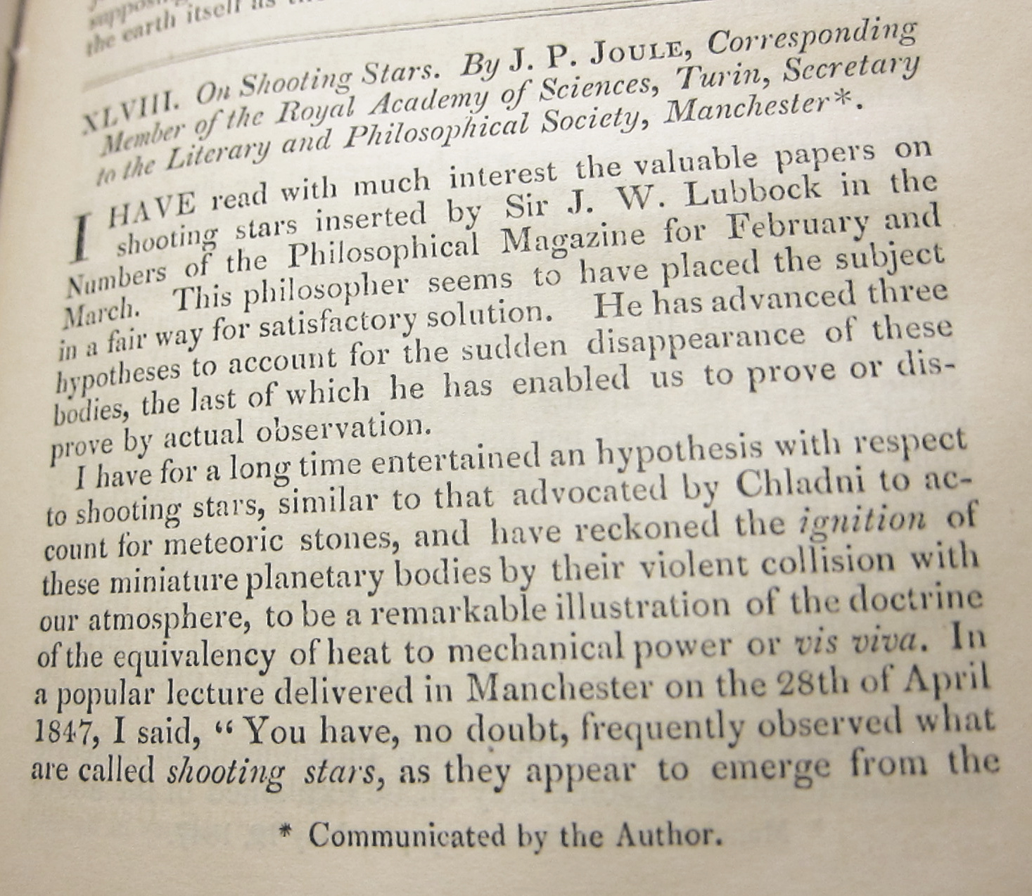 After addressing some issues of "shooting stars", Joule writes his lovely closing sentiments, which to me can be easily arranged into a bit of "Found Poetry"--that is, it is the simple restructuring of the two paragraphs into a poetic format, and without changing any of the words. It is an interesting process, and I think Joule's language easily transcends its sleepy place at the end of a mostly-forgotten work half-way through a scientific journal.