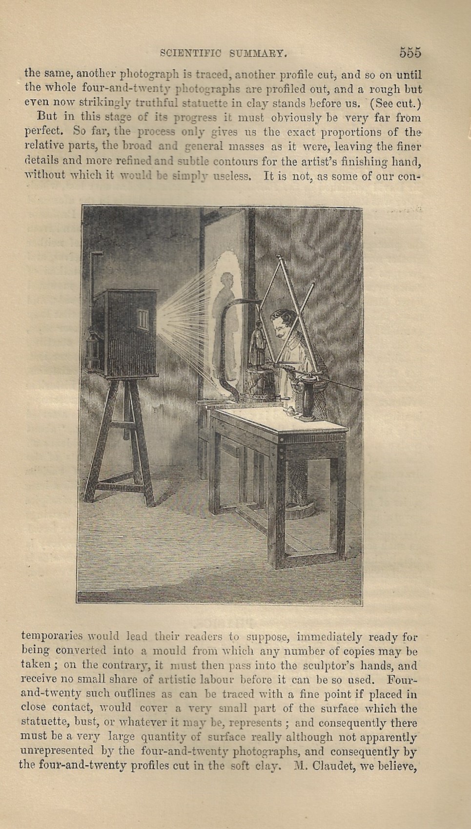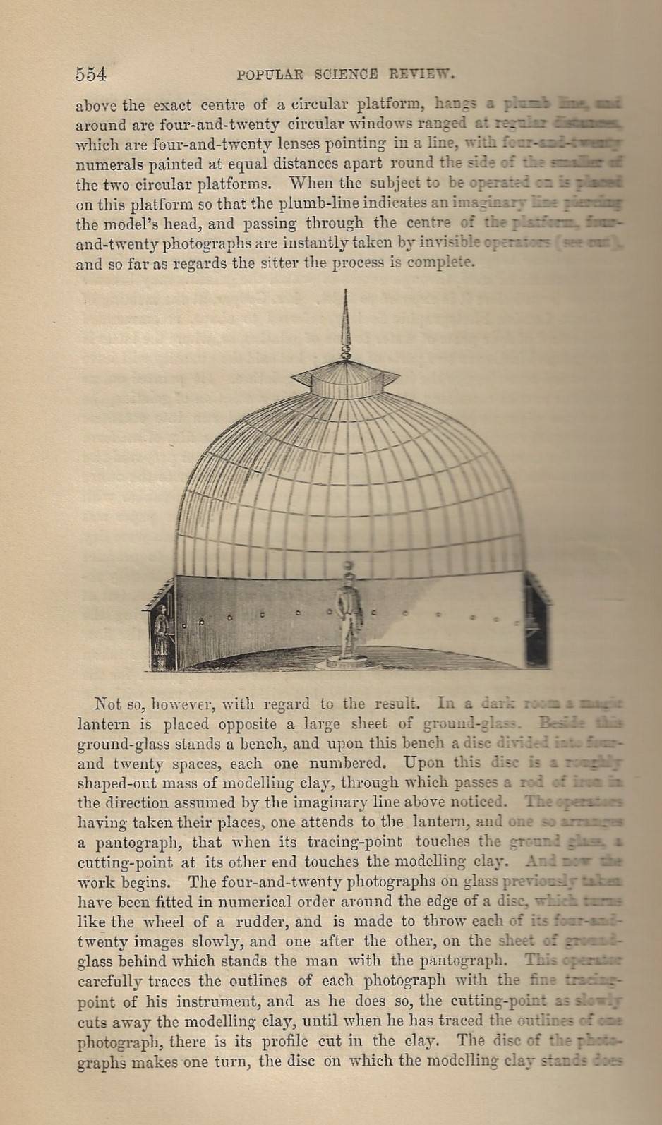 Well, the title to this post is not quite right as we would think of it in modern terms: this one is a human-based photo-aided clay fabricator of 2-D images into 3-D, which is something. What we have here is a dedicated apparatus for making a continuous photographic 360-degree view of a subject, set in order on a revolving disc on a magic lantern and projected onto a screen with a sculptor viewing the progression and making cuts and changes to his lump of clay in response to the change of perspective. The photographs of the subject were made in a circular hall, the walls of which hosted 24 regularly-spaced cameras working in unison to make a complete photographic record of the subject. The images were then taken and arranged in order on a large disc and portrayed slowly on a screen behind which the sculptor worked his magic.