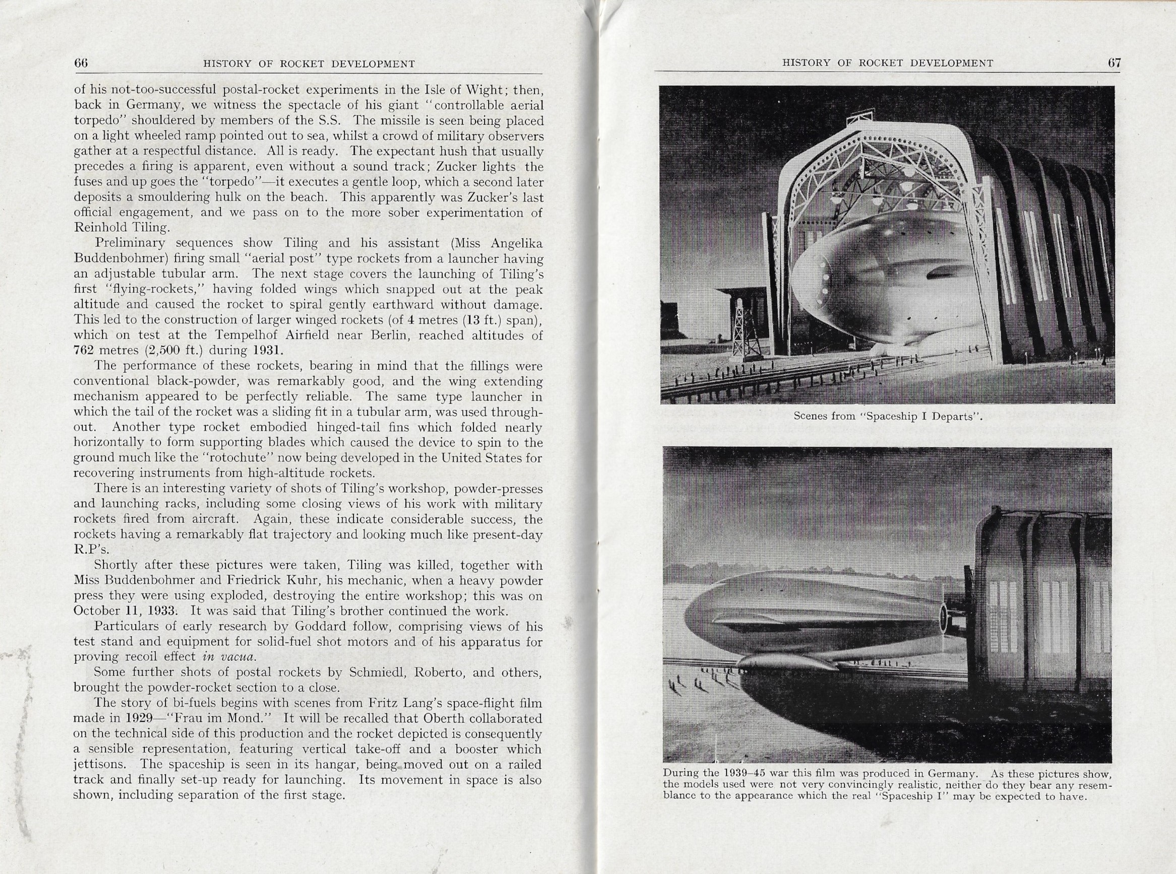 I found the references to "Spaceship I" (pictured above) to be very intriguing, though outside of two images of models for the proposed dirigible-like behemoth almost no other information is presented.