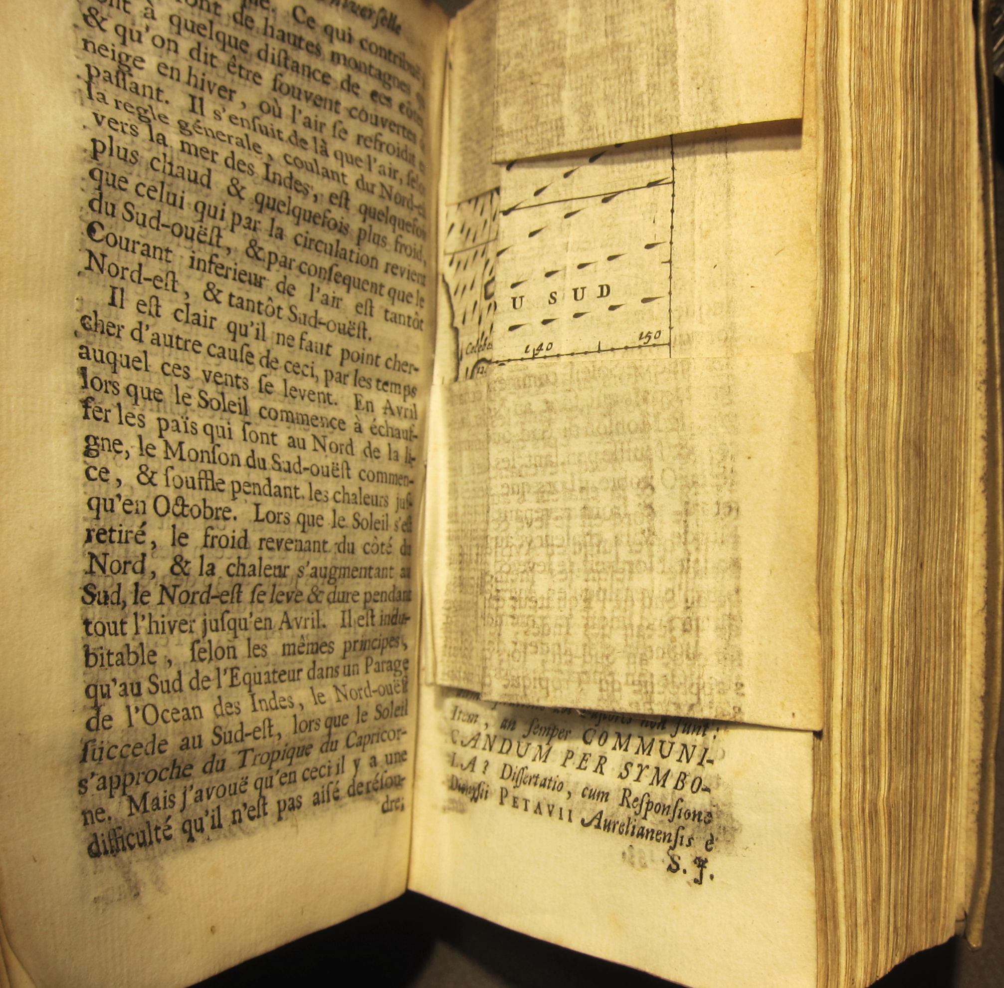 1. HALLEY, Edmund. "Extrait du Journal D'Angleterre, contenant one Relation Historique des Vents reglez & des Monsons que l'on remarque dans les Mers qui sont entre les Tropiques, ou qui n'en sont pas éloignées, avec un Essai de Physique touchant leurs causes naturelles par Mr. Halley", in Bibliothèque universelle et historique, Amsterdam, 1687, published by Warsbergew, Boom, and VanSomeren; vol 4, pp. 66-93 in the volume of (18), 552, (22)pp, with two folding plates, one of which is the first weather map. 142X80mm, bound in vellum. The famous map (14.8 × 48 cm) is very fresh and strong, and has only one minor defect—a small 1/2” teat at upper right edge. Other than that it is in excellent condition.