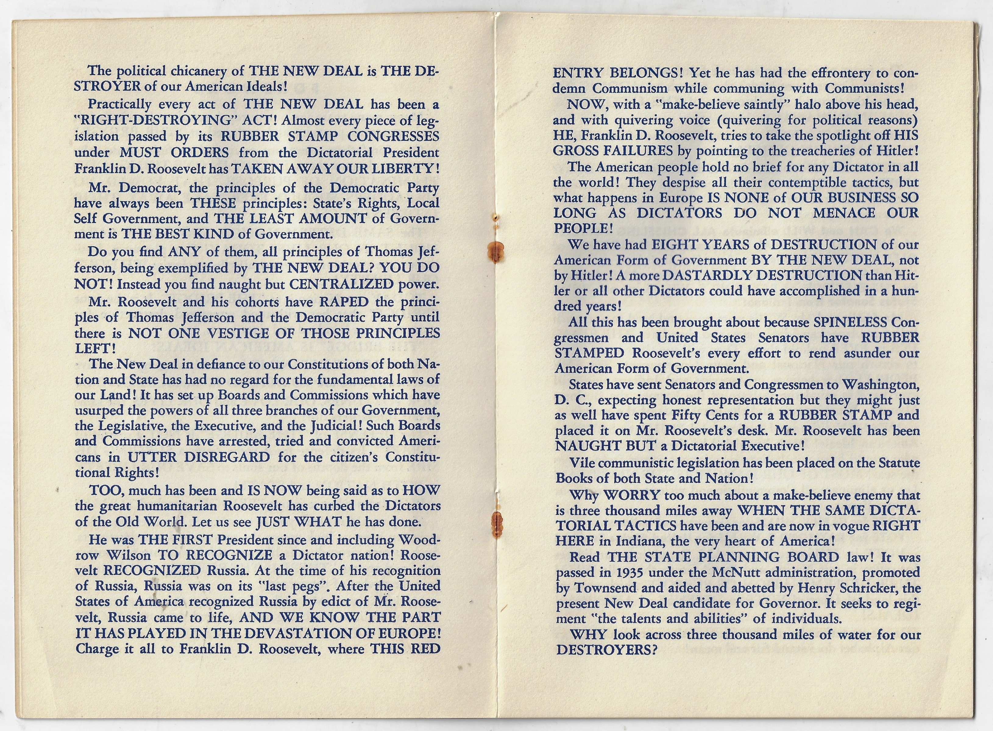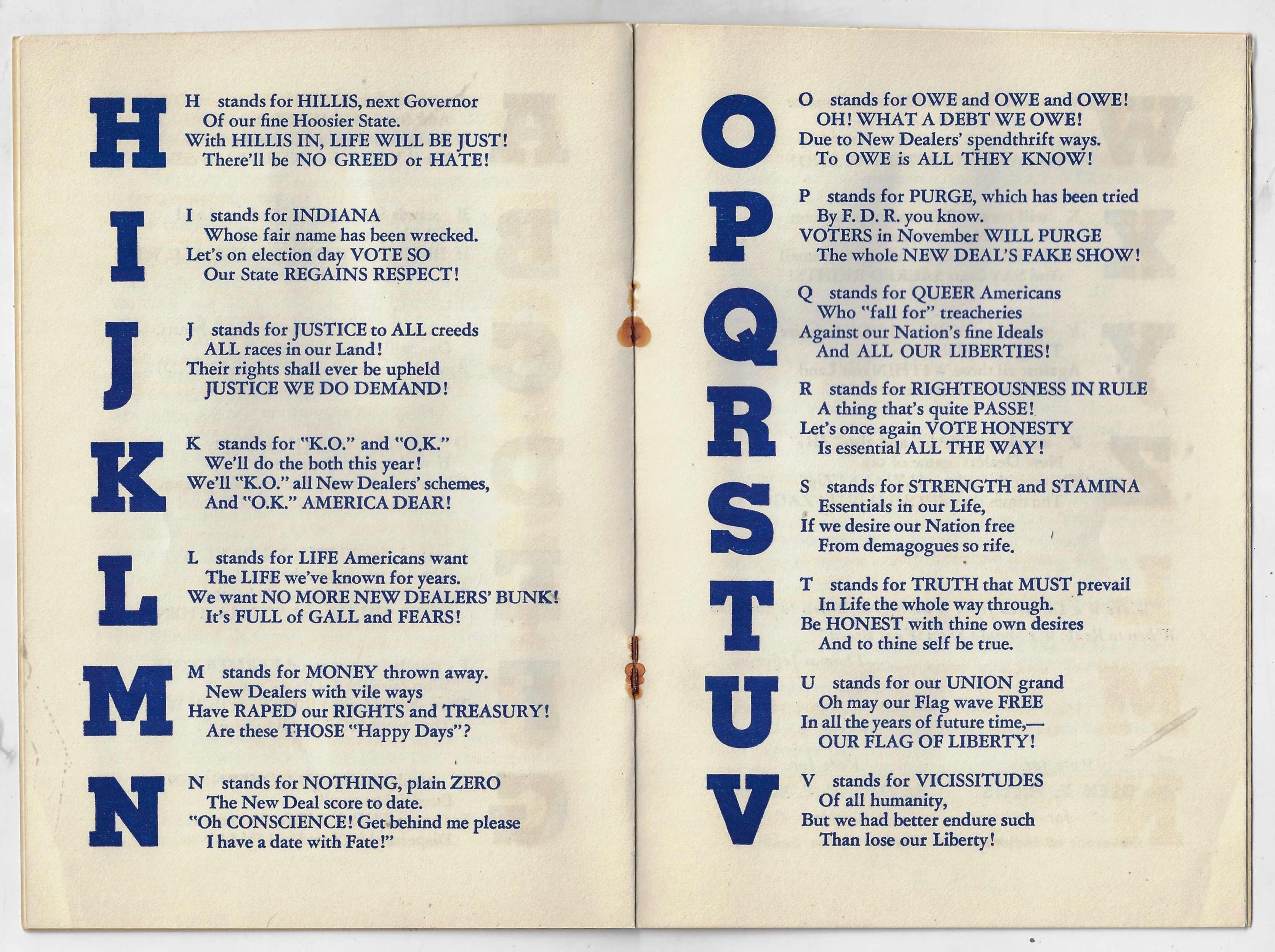 I'm not often able to make a post in the "Alphabets" category of this blog, though I can today after finding this untempered, bolded, all- and random-capped, exclaimed attack on Franklin Roosevelt and the New Deal. Charles R. Parker's Primer for Hoosiers, ABC which was printed for Parker-Daniels Co. of Indianapolis in 1940, is a top-percentile viciously anti-Roosevelt work as there ever was. Parker's pamphlet was a polemic proclaiming patriot punditry (sorry) for a couple of Indiana politicians while taking enormous and unsubstantiated baby bites into the fringes of Roosevelt (powering into his third term) and the New Deal (which was pretty much folded in at this point). This pamphlet is only ten quick pages, but in it we find descriptions of the president as a robber, dictator (many times), destroyer, and so on who uses Hitler as a shield and whose policies of chicanery have devastated, menaced, destroyed, and raped the principles and Constitution of the U.S. Overall the writing and style is not far from what we have in the White House, right now.