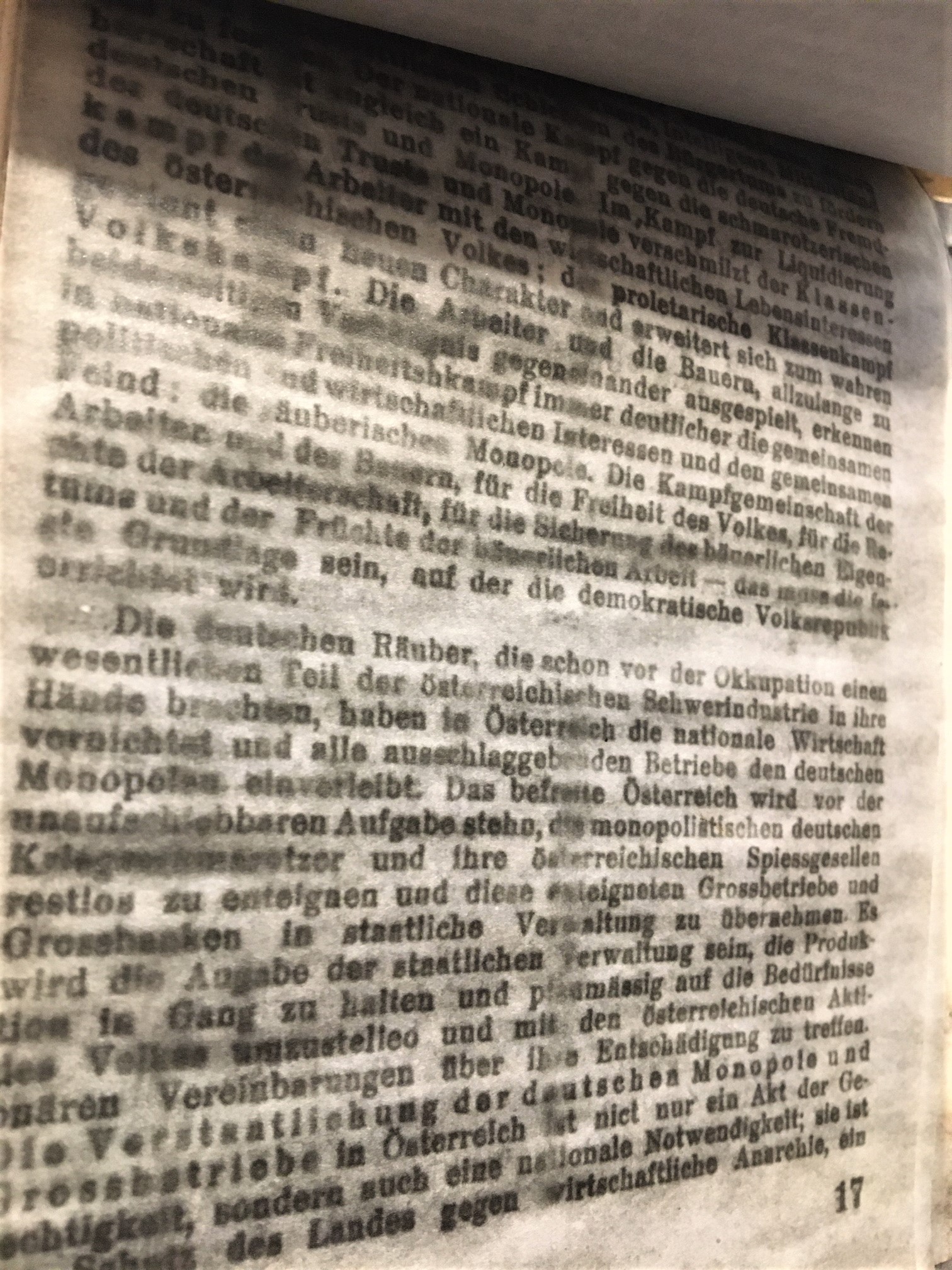 First of all this effort was written by someone associated with the Communist Party of Austria no later than 1944 and is titled Auf zum Kampf Freiheit und Wiedergeburt Osterreuchs, or The Fight for Freedom and Rebirth in Austria (or Let's Fight for Austrian Freedom and Rebirth). This means that this was a highly incendiary work for an Austrian to possess in their Nazi-dominated country. The Nazis absorbed Austria ("annexed" is the word found more often describing the Nazi takeover and obliteration of Austria as a sovereign nation) Austria in March 1938 and were of course massively anti-Communist, except of course for the Communists in the Soviet Union, who Hitler externally tolerated in the public lull of his bitter hatred between the Molotov-Ribbentrop Pact and the beginning of Operation Barbarossa on 22 June 1941, a period where he was able to use the Soviet Communists to his advantage before attacking and killing millions of Russians.
