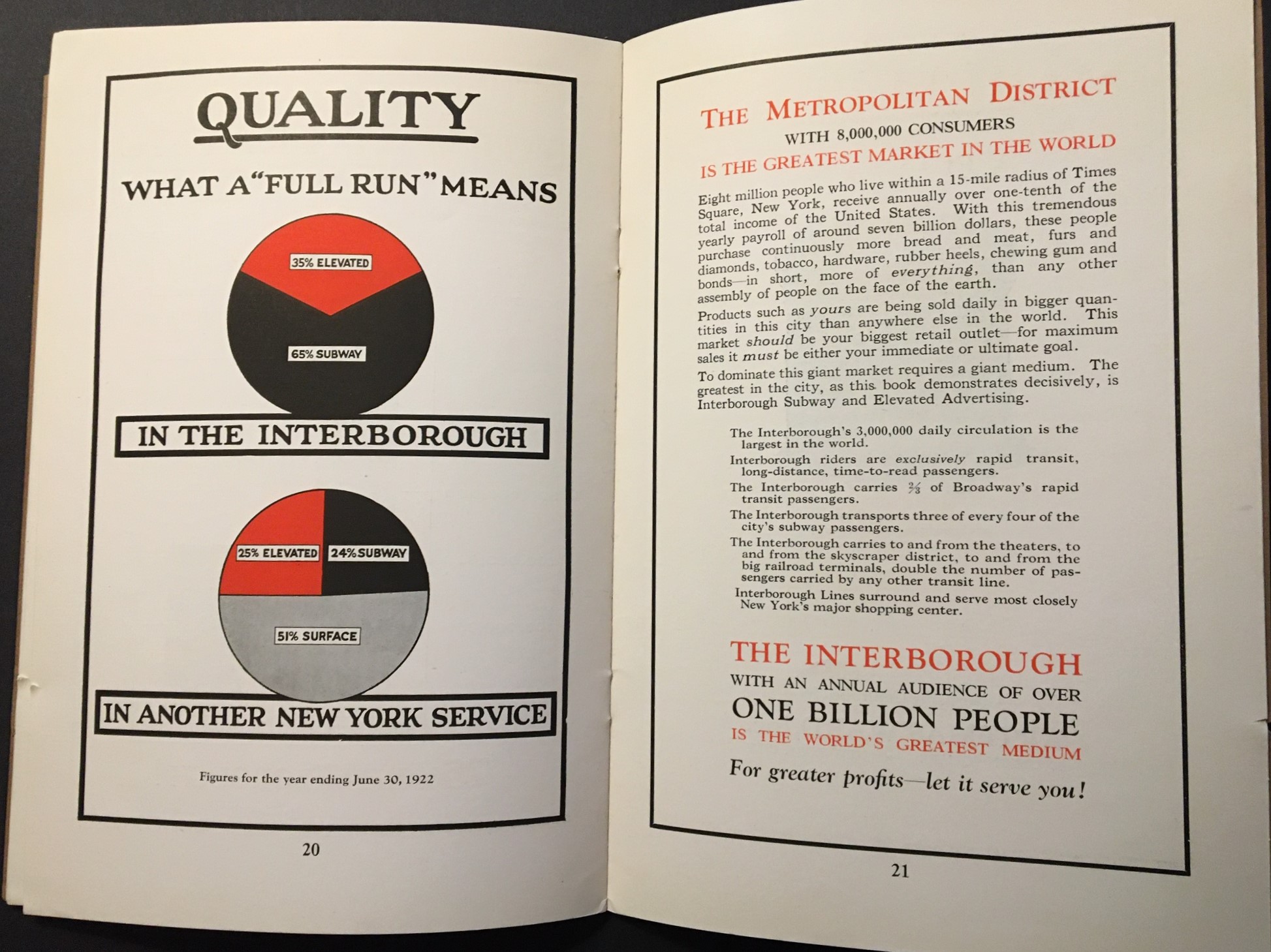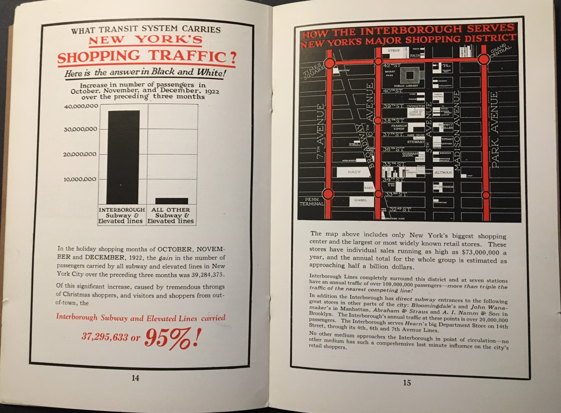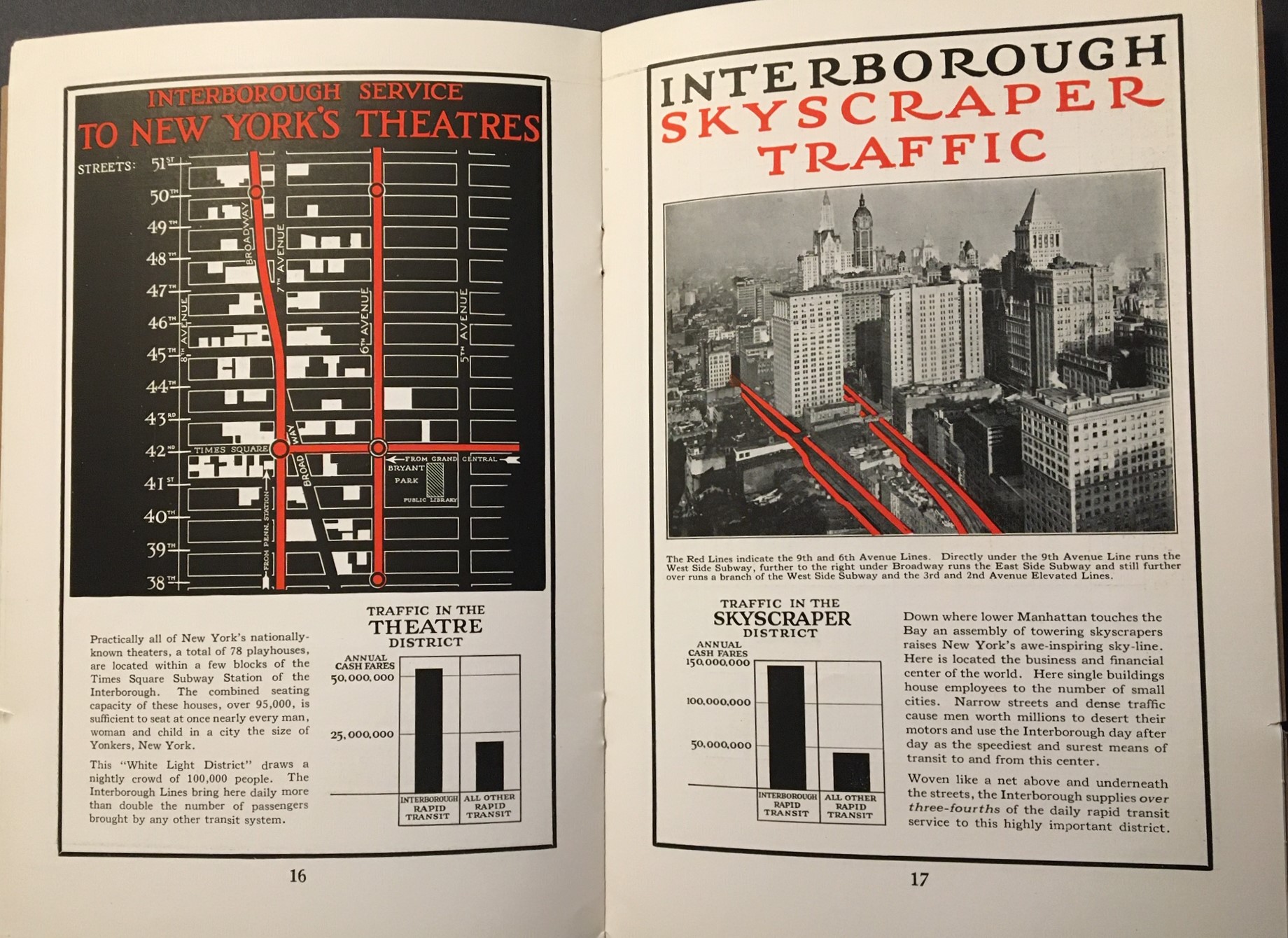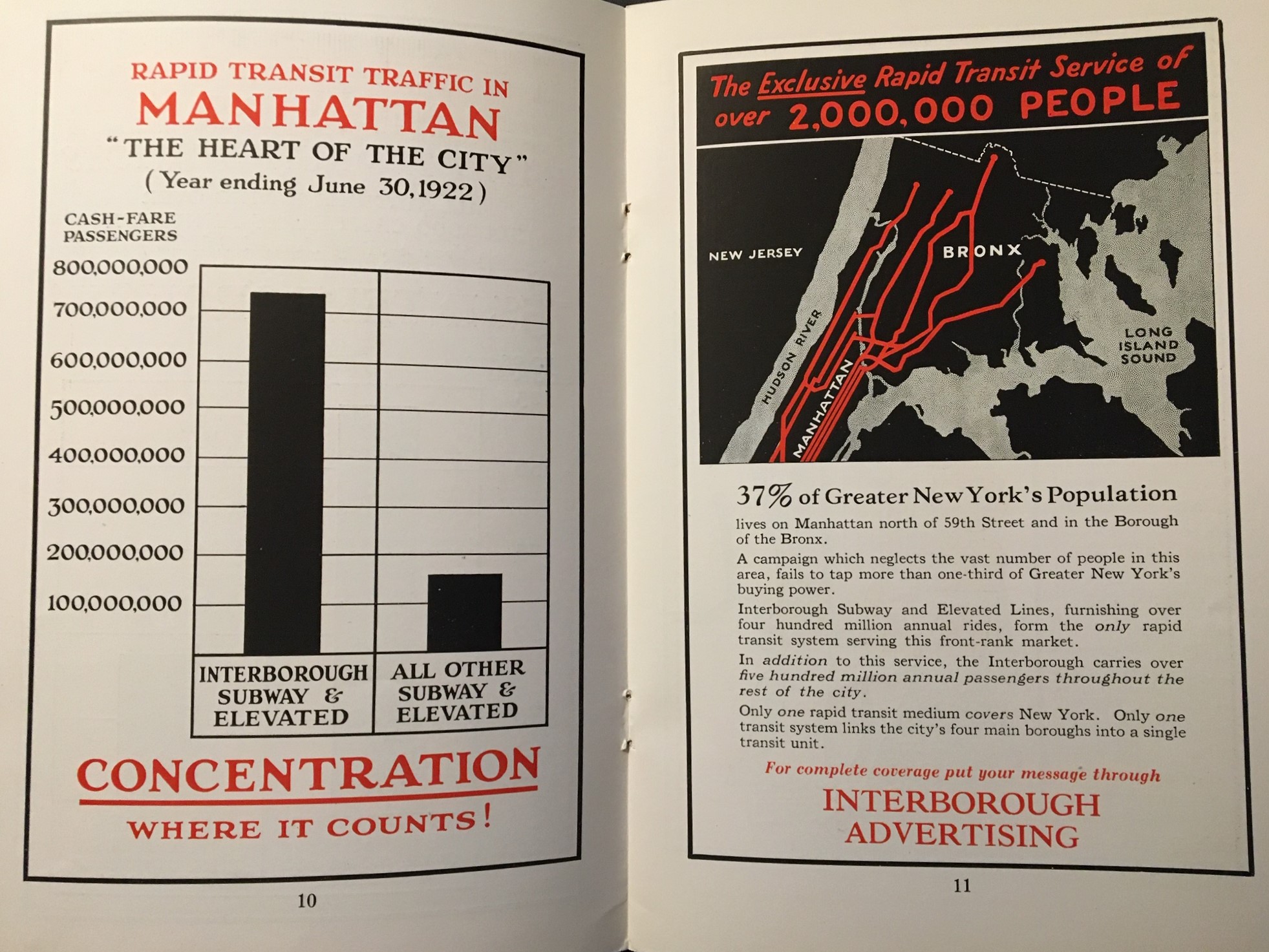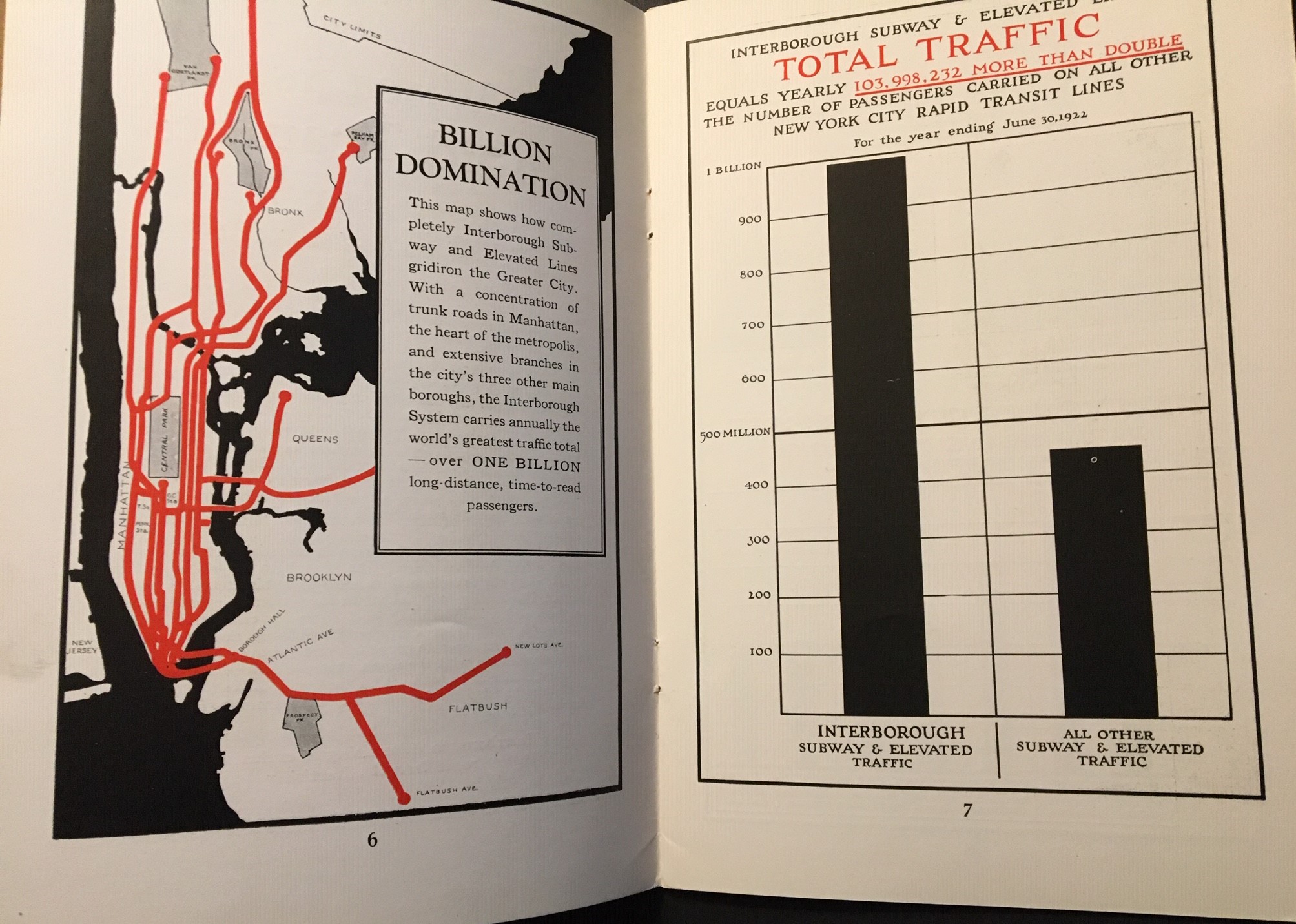 I've just found this delightful little publication beautifully extolling the possible advertising advantages of the Interborough Subway and Elevated Lines of New York City, Artemas Ward's New York's Rapid Transit Traffic in the Graphic, from 1923. It really does present the numbers and highlights them with some unusual and bright maps of the subway system. This was the IRT (the Interborough Rapid Transit system), which was a private concern that operated from 1903 until 1940, when it was purchased by NYC. This subway system in general was, well, entirely different from the one that I traveled 1968-1974 or so, back when you could barely see through the car windows because they were so heavily coated with graffiti...Anyway, I've reproduced most of it below as there are no copies of the pamphlet in any library according to WorldCat. The design of the first one--with the giant "Broadway"--is terrific.