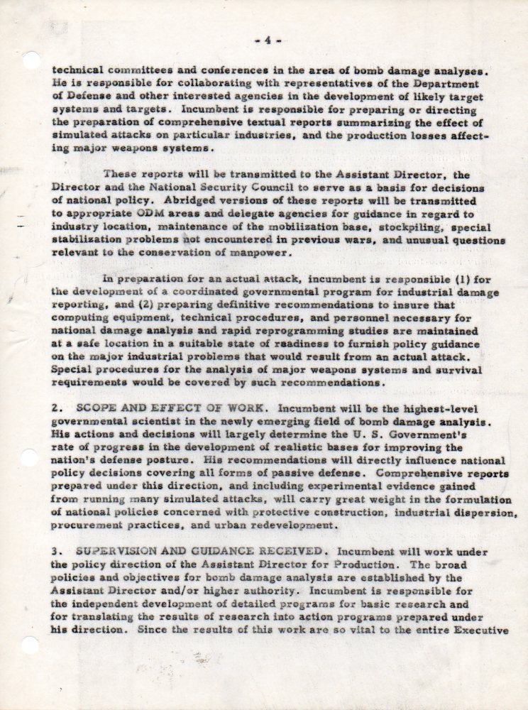 This position description was for "Chief, Damage Assessment Division", was was the part of the Office of Emergency Preparedness (which operated under the auspices of the Executive Office of the President, and then under the Office of Defense Mobilization (ODM), and then under the Production Area, and then, finally, the Damage Assessment Division DMA). The job of the DMA was to identify what would happen to the essential production facilities that would keep the country going--industrial, technical, medical, biological, and so on--how they would be targeted, and how they might survive an attack. This also applied to the people who would be required to be in charge of all of this. Damage assessment.