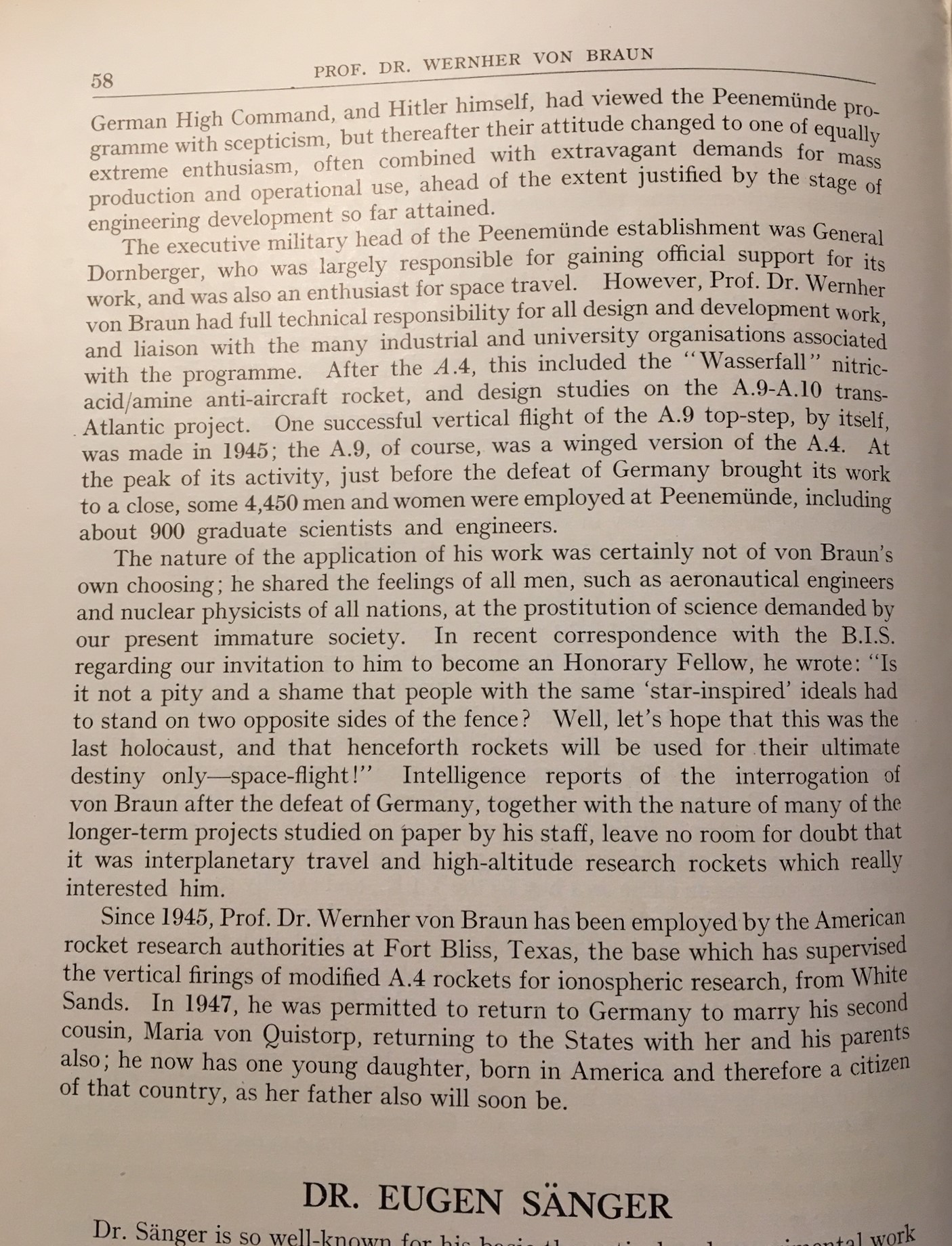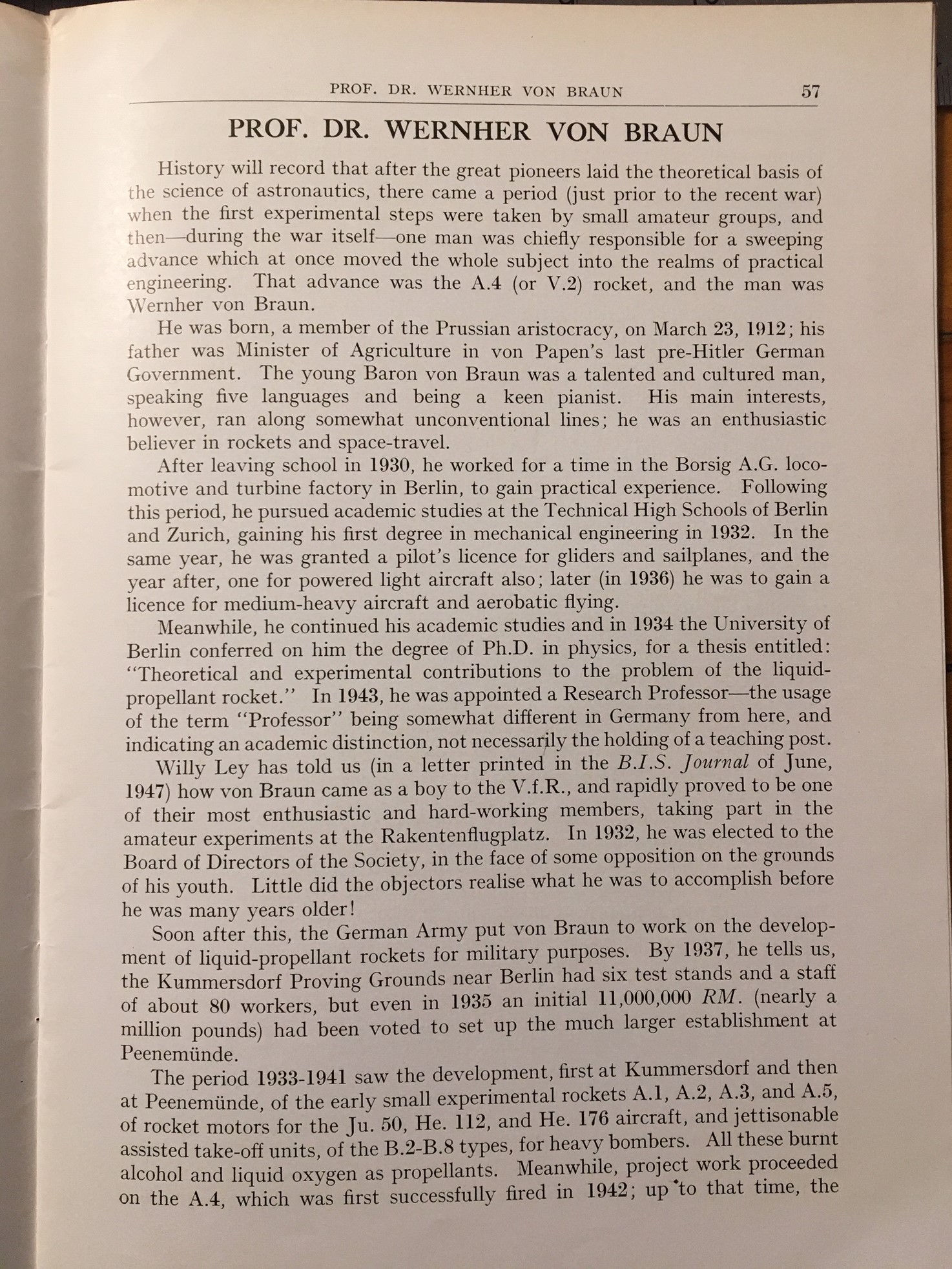 There's a very subdued and whitewashed biography of Wernher von Braun sleeping in a few pages of the Journal of the British Interplanetary Society1, published in March 1950, when war wounds were still wounds, and the dead still of course dead.