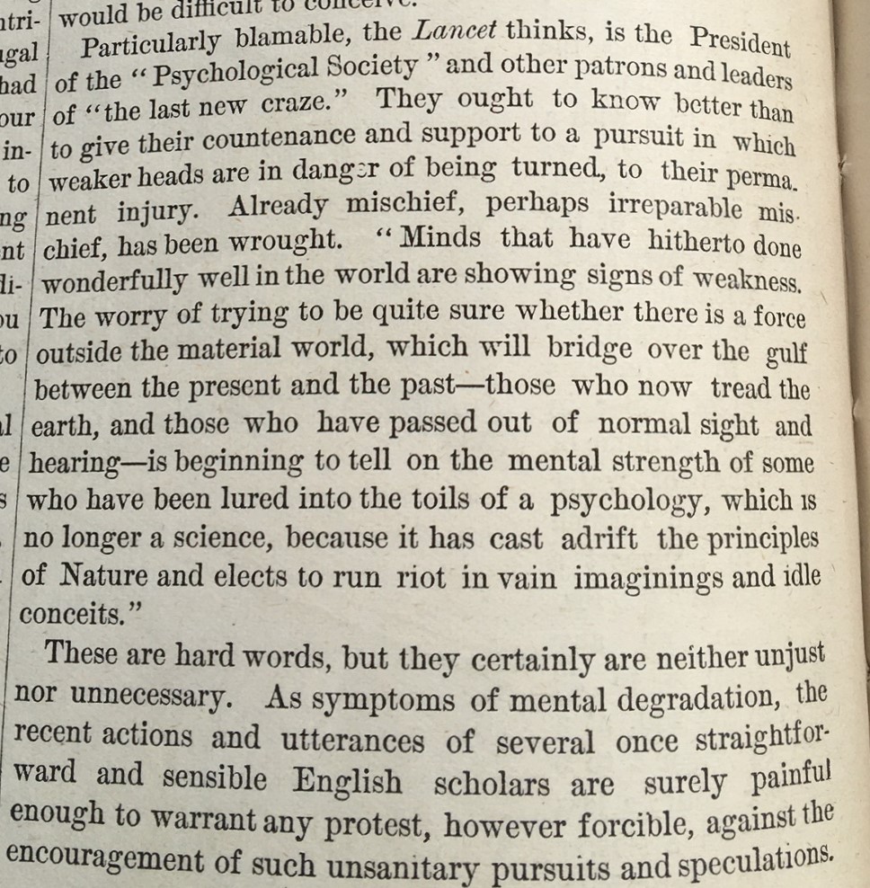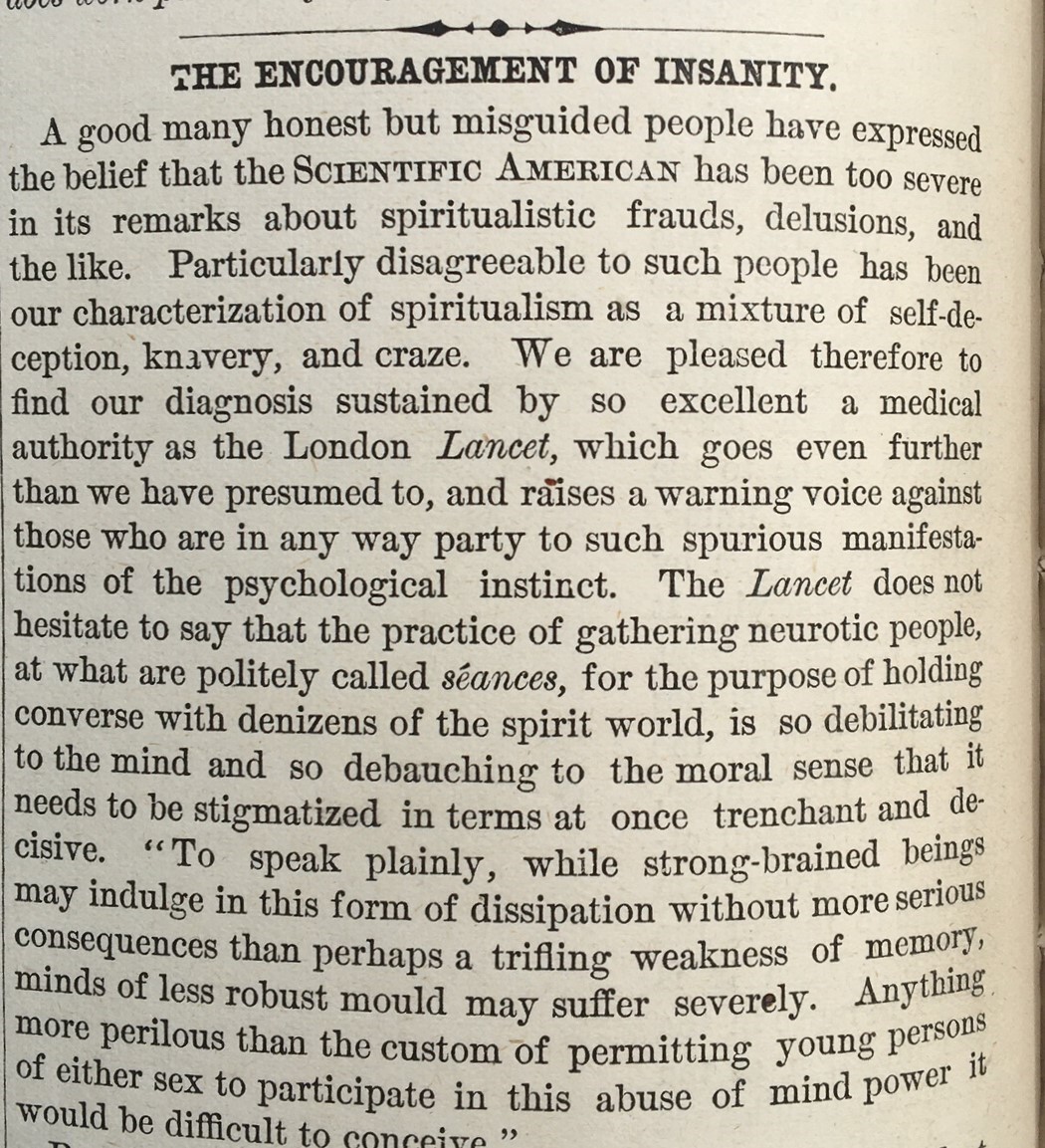 Well. The Scientific American (1913) delivered quite a blow against the current "craze" of spiritualisms and seances, which they characterize as a mixture of "self-deception and knavery". They had no room for it whatsoever, and let their readers know it. These practices were "symptoms of mental degradation that will cast adrift principles...and elect to run riot in vain imaginings and idle conceits". The editor also brought The Lancet on board in the condemnation of the Spiritualism racket, quoting the great medical journal saying that the talking-to-the-dead racket was "debilitating to the mind and so debauching to moral sense it needs to be stigmatized in terms at once trenchant and decisive". An Edgar A. Poe vicious book review this is not, though they do communicate their displeasure with the whole racket in very forceful words.