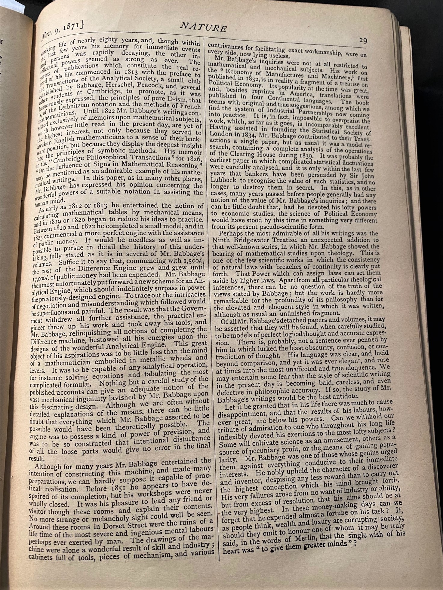 This is a fine and understanding obituary of Charles Babbage--it appeared in Nature on 9 November 1871, just two weeks after