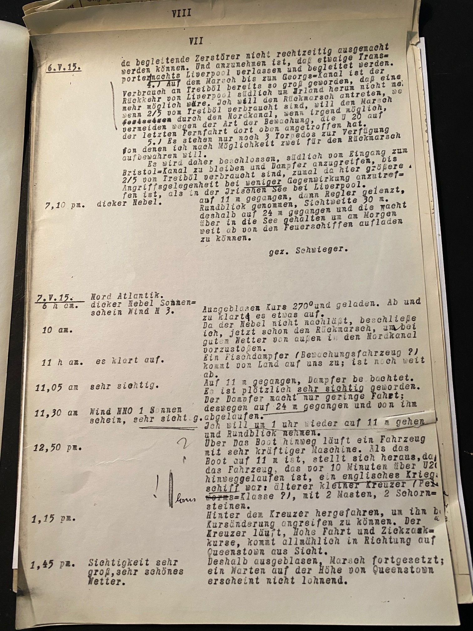 The sheets presented here1 are very early photographs of the original war diaries of Captain Walter Schwieger, the captain of the German submarine SM U-20 who sank the RMS Lusitania in 1915.