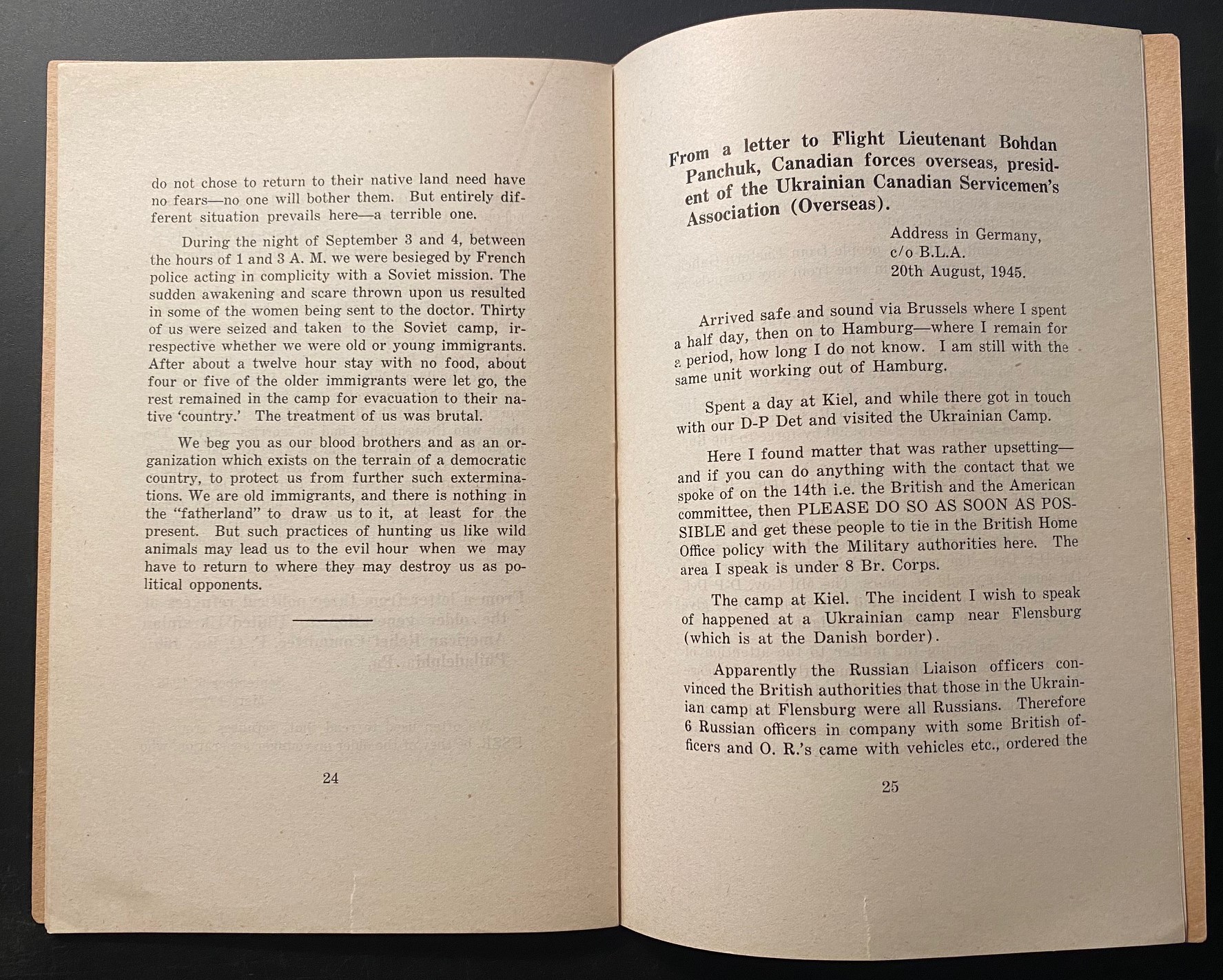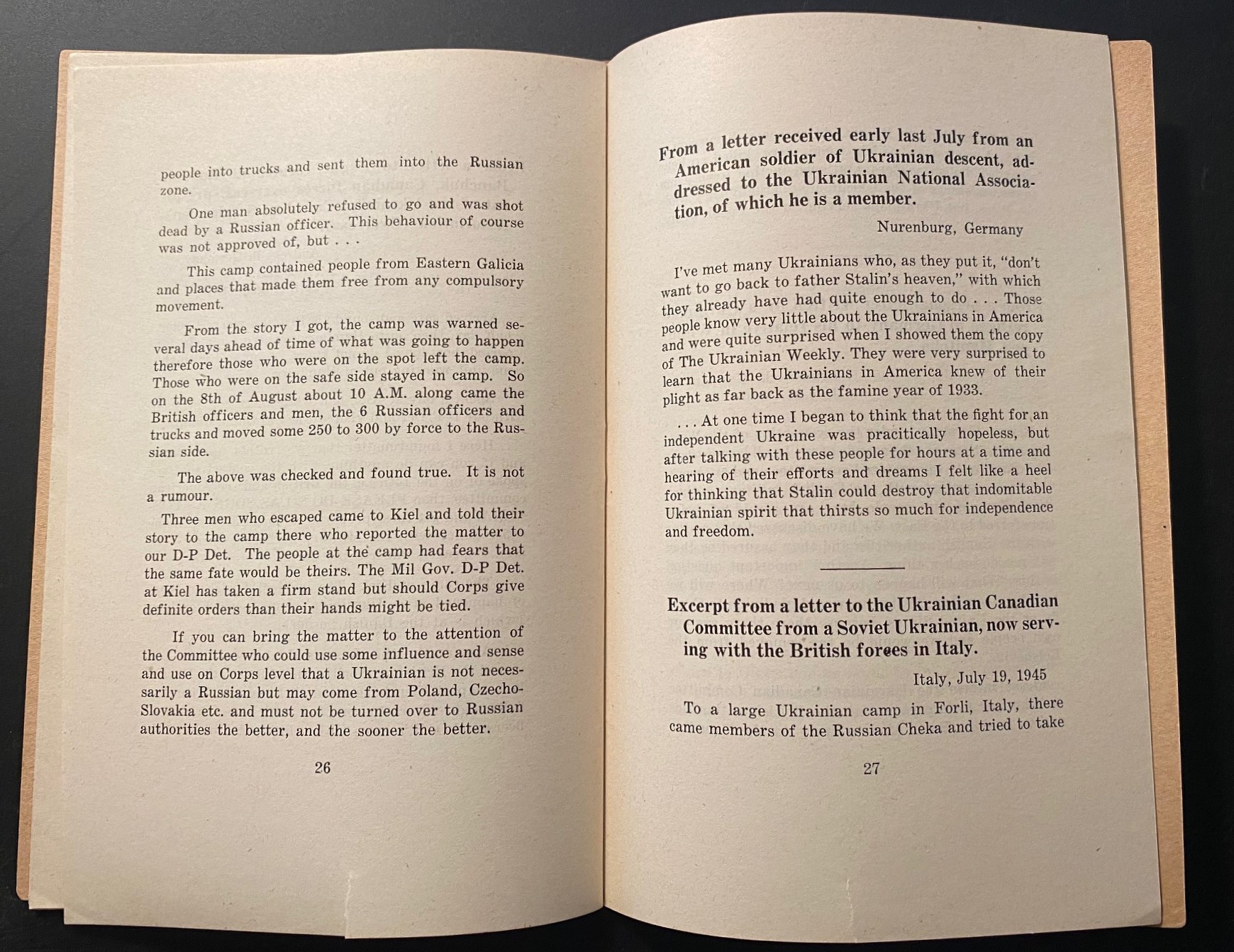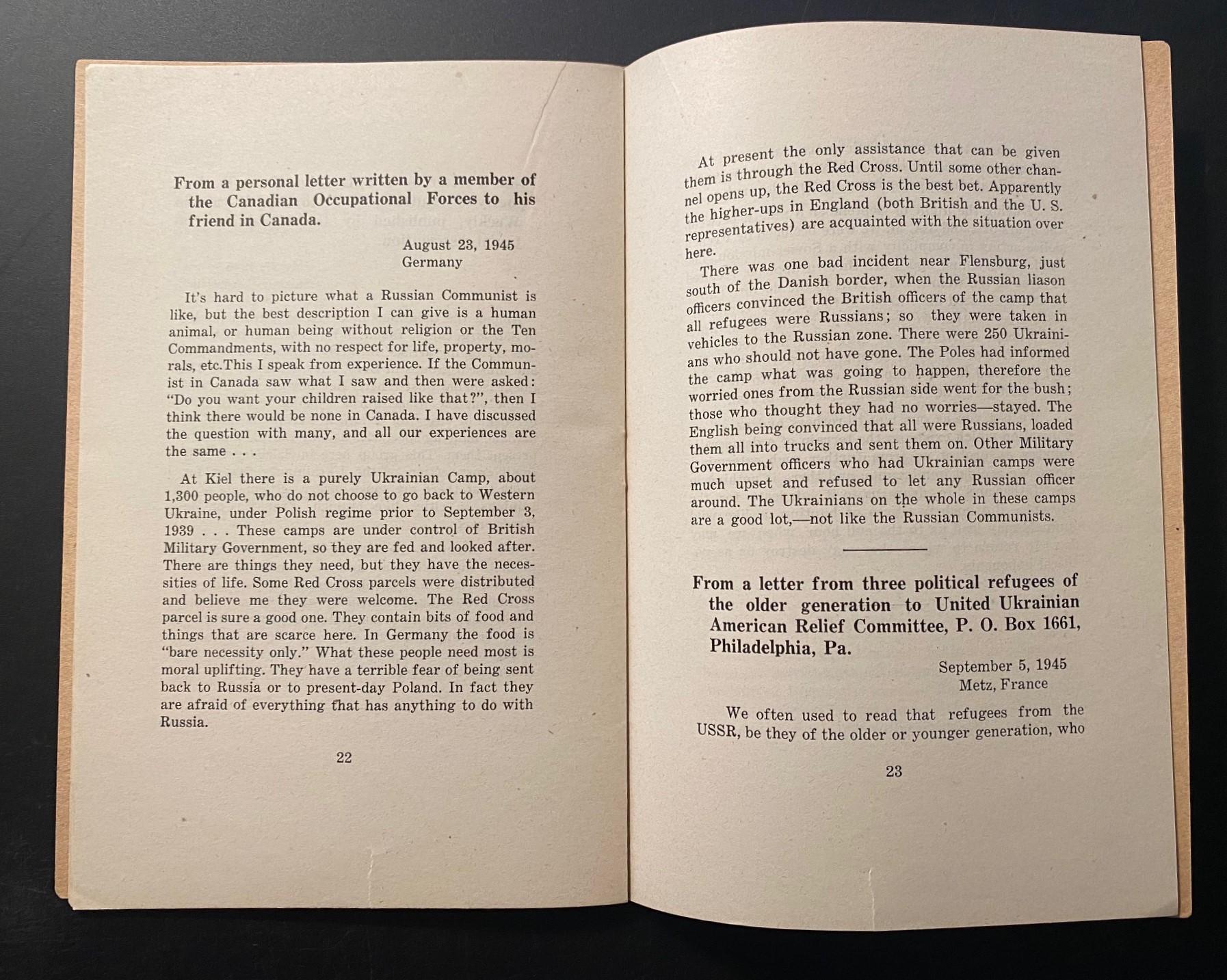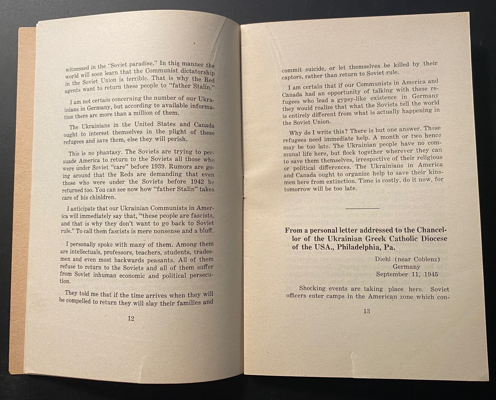 The pamphlet Plight of Ukrainian DPs : a few typical letters of many being received daily from Europe describing the tragic plight of Ukrainian displaced persons whom the Soviets would forcibly repatriate and doom to enslavement, persecution or death, was published in 1945 or 1946 (but not later than 26 March 1946). It carries a terrific burden over its 31 pages, describes the "plight" of Ukrainian "DPs" at the end of WWII. "Plight" is a very weak word for their situation, as is the term designated them, "DP" or "displaced person". These people--several million of them—from what I understand had been slave laborers, taken by the Nazis in the advance through Central Europe, and sent to work in German factories and fields. Many were theoretically and sub-practically paid a wage, though in general much of that went to providing themselves food and clothing and such that enabled them to work. These people were known as Ostarbeiter (Eastern Laborer), and at the end of the war many were repatriated to their country of origin. Of the 3-5 million Ostarbeiter, about 2.5 million remained alive at war's end, with the vast majority--over 2 million--being from the Ukraine. This pamphlet details some of the terrible accounts of Ukrainians being repatriated to the Soviet Union and being treated as plagued outsiders, criminals, and worse, some simply executed, while hundreds of thousands of others were sent on for "re-education", with many winding up in the Gulags. It was a terrible position to be in--the slave returned home after the war to be treated as a criminal, and slave again.