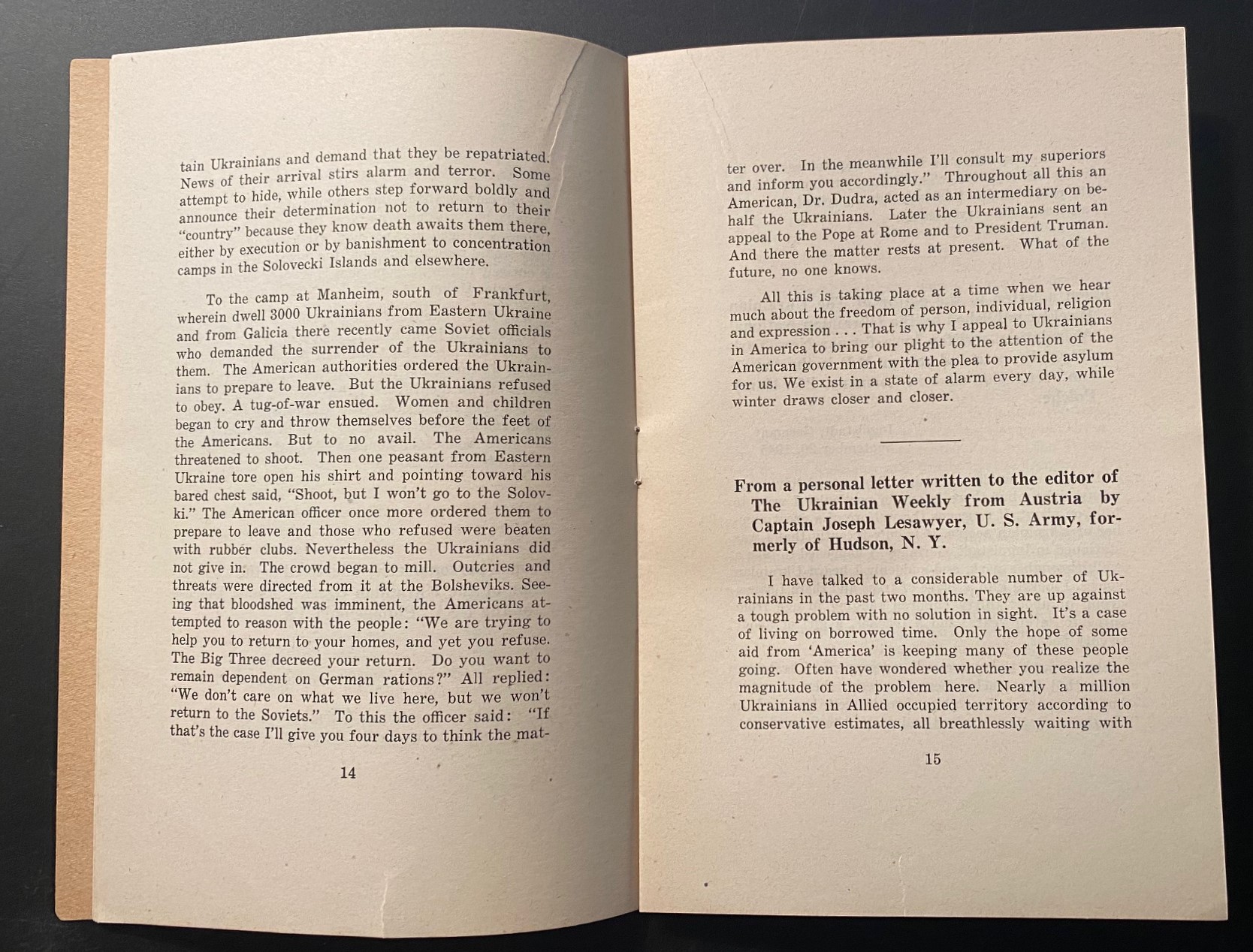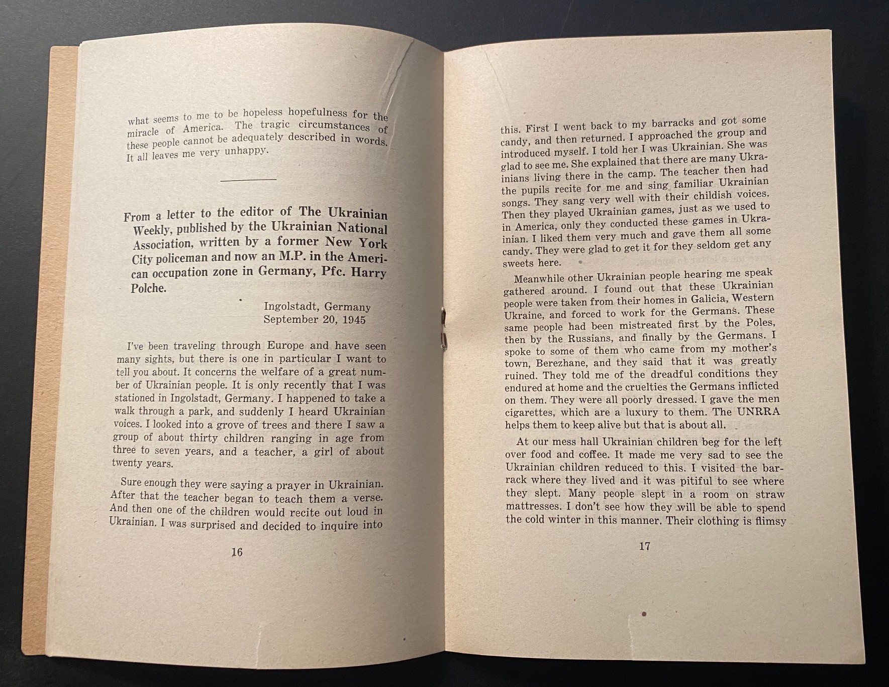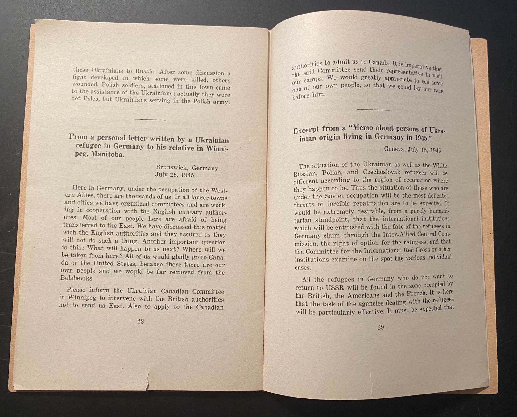 The pamphlet Plight of Ukrainian DPs : a few typical letters of many being received daily from Europe describing the tragic plight of Ukrainian displaced persons whom the Soviets would forcibly repatriate and doom to enslavement, persecution or death, was published in 1945 or 1946 (but not later than 26 March 1946). It carries a terrific burden over its 31 pages, describes the "plight" of Ukrainian "DPs" at the end of WWII. "Plight" is a very weak word for their situation, as is the term designated them, "DP" or "displaced person". These people--several million of them—from what I understand had been slave laborers, taken by the Nazis in the advance through Central Europe, and sent to work in German factories and fields. Many were theoretically and sub-practically paid a wage, though in general much of that went to providing themselves food and clothing and such that enabled them to work. These people were known as Ostarbeiter (Eastern Laborer), and at the end of the war many were repatriated to their country of origin. Of the 3-5 million Ostarbeiter, about 2.5 million remained alive at war's end, with the vast majority--over 2 million--being from the Ukraine. This pamphlet details some of the terrible accounts of Ukrainians being repatriated to the Soviet Union and being treated as plagued outsiders, criminals, and worse, some simply executed, while hundreds of thousands of others were sent on for "re-education", with many winding up in the Gulags. It was a terrible position to be in--the slave returned home after the war to be treated as a criminal, and slave again.