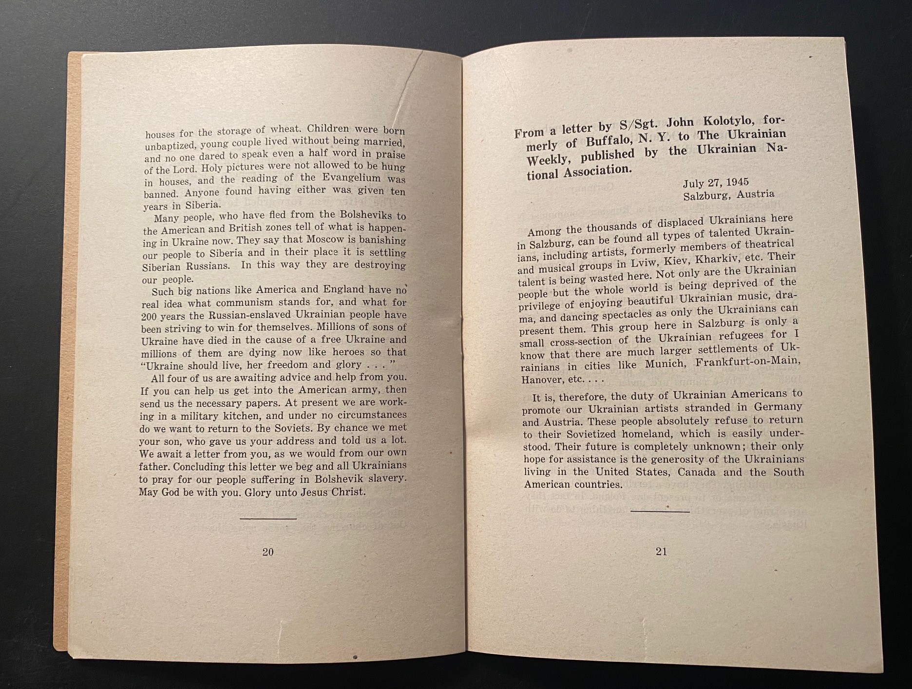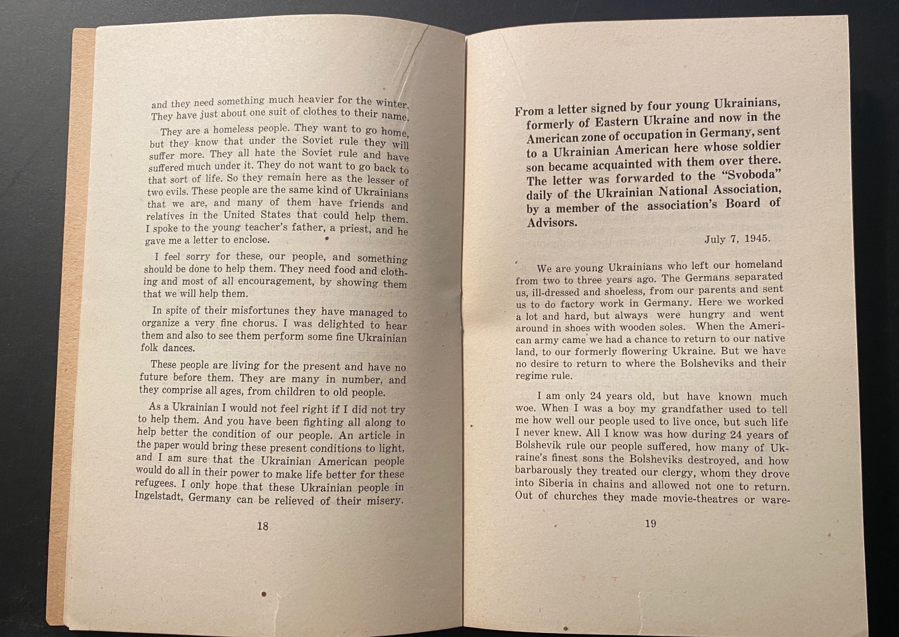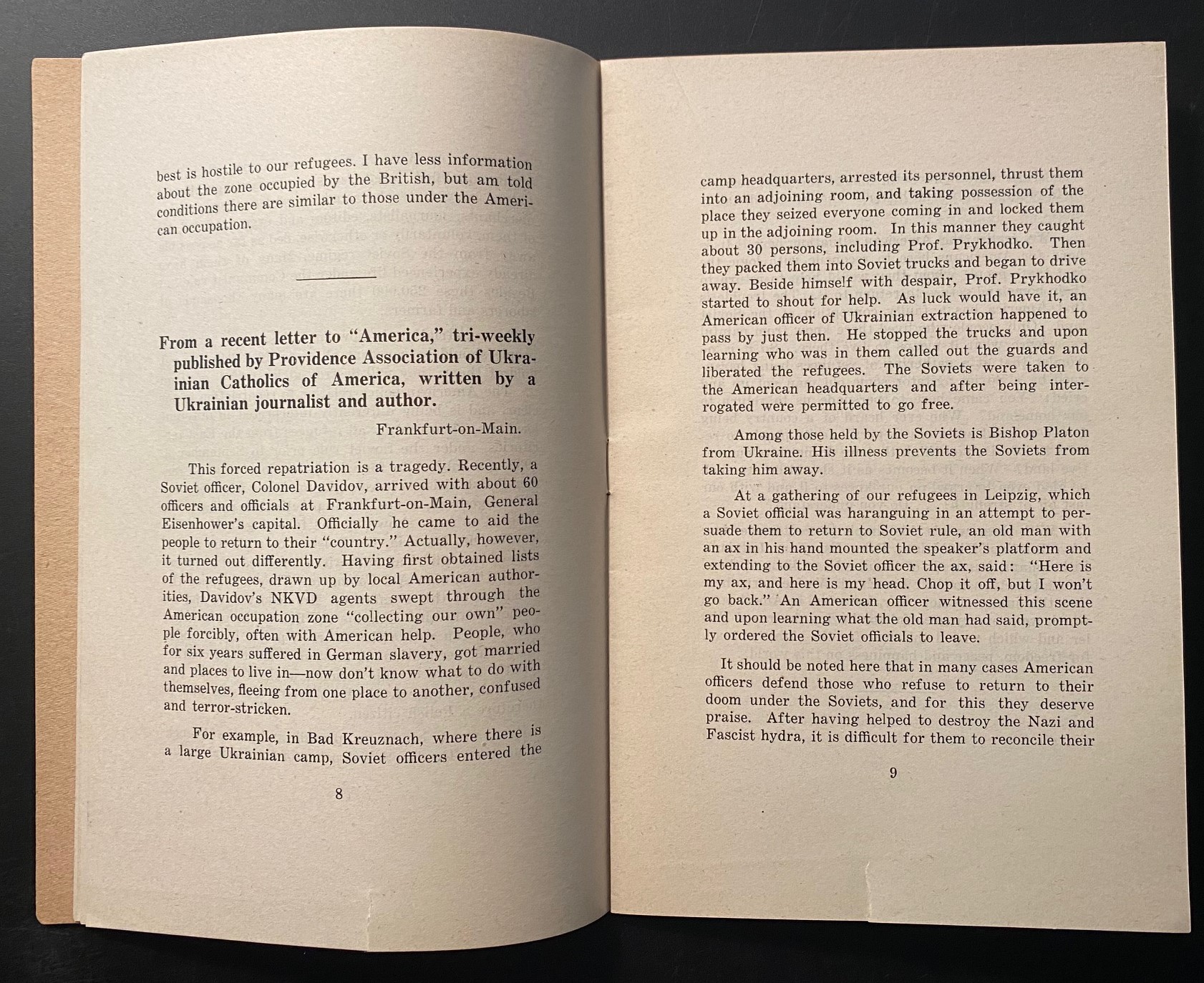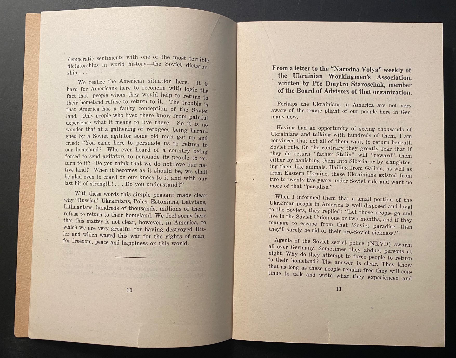 The pamphlet Plight of Ukrainian DPs : a few typical letters of many being received daily from Europe describing the tragic plight of Ukrainian displaced persons whom the Soviets would forcibly repatriate and doom to enslavement, persecution or death, was published in 1945 or 1946 (but not later than 26 March 1946). It carries a terrific burden over its 31 pages, describes the "plight" of Ukrainian "DPs" at the end of WWII. "Plight" is a very weak word for their situation, as is the term designated them, "DP" or "displaced person". These people--several million of them—from what I understand had been slave laborers, taken by the Nazis in the advance through Central Europe, and sent to work in German factories and fields. Many were theoretically and sub-practically paid a wage, though in general much of that went to providing themselves food and clothing and such that enabled them to work. These people were known as Ostarbeiter (Eastern Laborer), and at the end of the war many were repatriated to their country of origin. Of the 3-5 million Ostarbeiter, about 2.5 million remained alive at war's end, with the vast majority--over 2 million--being from the Ukraine. This pamphlet details some of the terrible accounts of Ukrainians being repatriated to the Soviet Union and being treated as plagued outsiders, criminals, and worse, some simply executed, while hundreds of thousands of others were sent on for "re-education", with many winding up in the Gulags. It was a terrible position to be in--the slave returned home after the war to be treated as a criminal, and slave again.