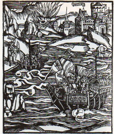The only thing that I'd rather have the artist improve in this print were the waves--the ones on exhibit here weren't very saucy. Admittedly, waves were a large problem so far as depicting them goes, what with the whole vast subject of fluid dynamics so little known at the time. THe person who would know this phenomenon best at this point--Leonardo--was thinking and working but wasn't sharing. His "Studies of water Formations” (c. 1507-09)? and the later, magnificent “Deluge” (1513, nearly the year of publication of the above) would stay hidden for centuries, the big step forward in the West having to wait for another 120 and 140 years (respectively) for the works of Benedetto Castelli, and Evangelista Torricelli,