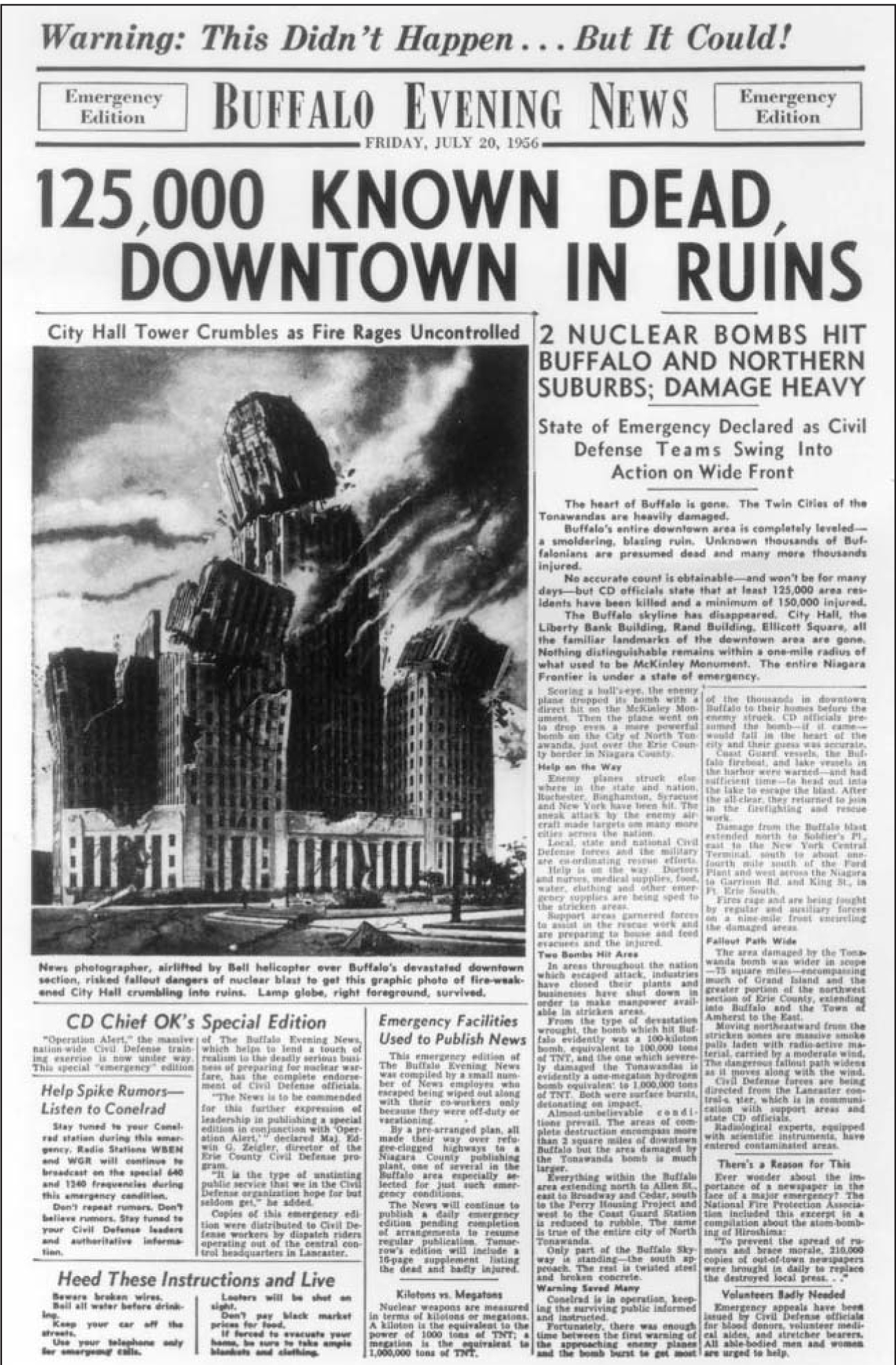 Since this appeared in a newspaper story--and a long story at that--it gave the exercise a real sense of urgency, to say nothing of the amount of fear that it generated. At least it didn't appear as the front page, as was the case with some other end-time scenarios, like these newspapers for Brooklyn and Buffalo and Grand Rapids (below).