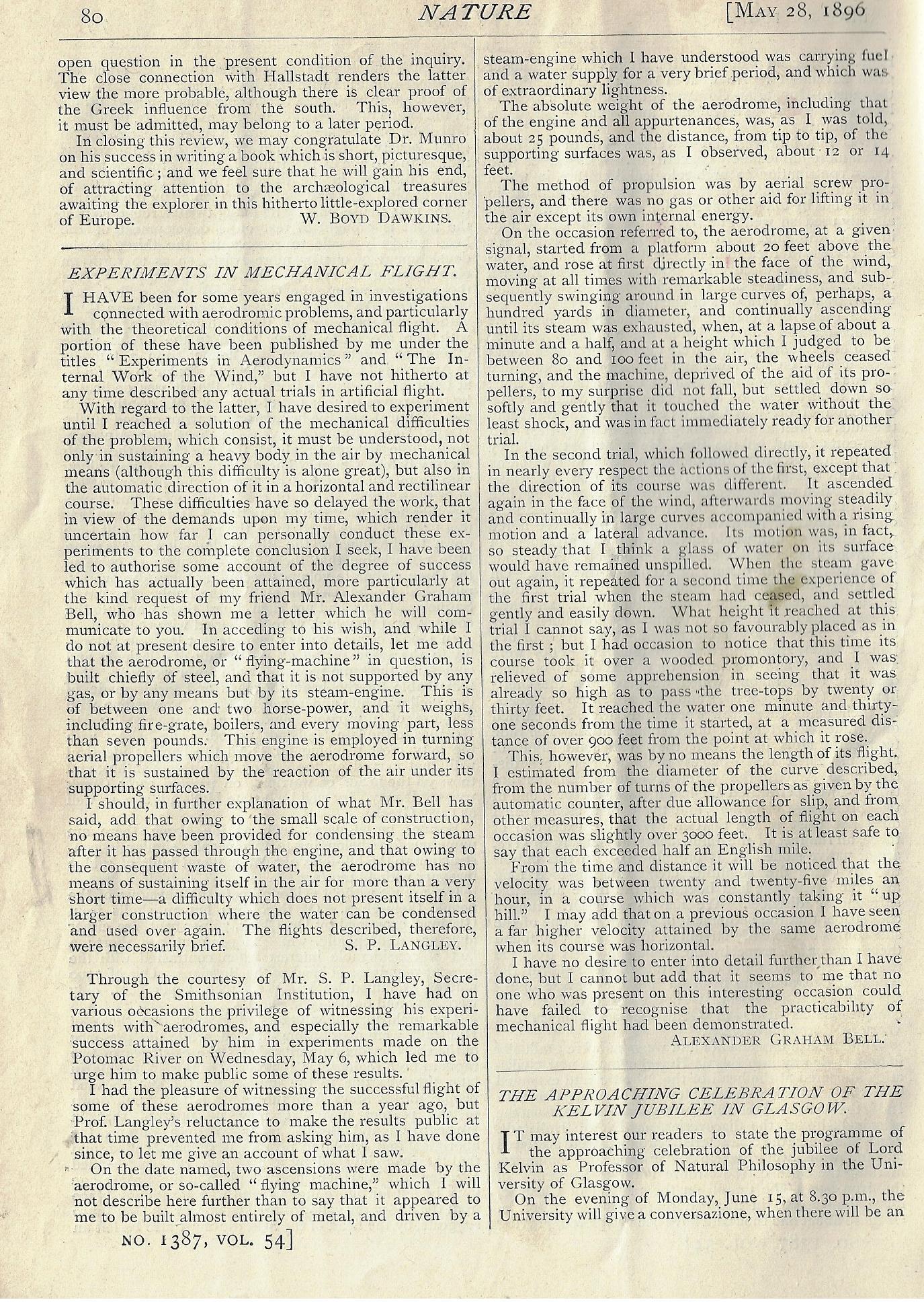 I came upon this article last night in the pages of Nature--it doesn't look like much, but it turns out to contain a first-person account of an historic moment in the history of aviation. The article, “Experiments in Mechanical Flight”, is by Samuel Pierpont Langley (1834-1906) and Alexander Graham Bell (1847-1922). and appears in volume 54, May 28, 1896, page 80 in the issue of pp 73-96. It contains the first account printed in England of heavier-than-air non-piloted sustained powered flight--and proof that mechanical heavier-than-air flight with existing technology was real. (This article appeared on 28 May; a somewhat shortened account appeared in Comptes Rendus... two days earlier, on the 26th. The first printed announcement of the event seems to have been in Science, May 22, 1896, according to Brockett's Bibliography of Aeronautics, #7160.)