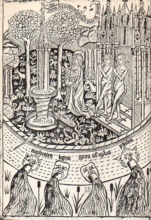 Eden is again fortified, this time in stone, with the ornamental drainspouts of the four rivers making their exit in the foreground. The glory of Eden abounds, but it is temptation that is presented them.