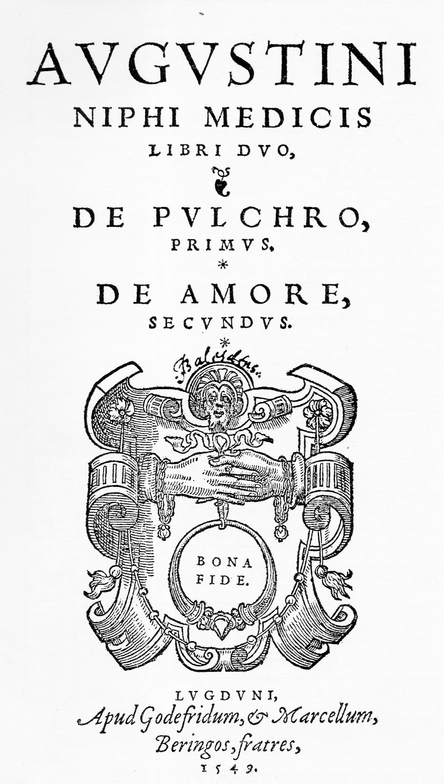 In Agustus Niphus, Libri Duo de pulchro liber primus, de amore librer secundus, and printed in Lyon by Beringen in 1549, the scholar and Aritotelian Agostino Nifo of Sessa (1473-1546) wrote two significant treatises on the nature of beauty and love (liber primus and secundus, respectively).