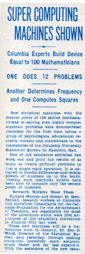I thought for a moment that the Oxford English Dictionary had been scooped in identifying the earliest usage of the term "super computer" when I saw this newspaper article in the wonderful book by Charles and Ray Eames called A Computer Perspective (Harvard University Press, 1973). The article refers to an unidentified machine at Columbia University in a March 1, 1920 article, which would beat the first use found by the OED in 1927 (see below) by seven years. So, I checked this out a little, and latched onto a reference to Dr. Ben D. Wood as the director of the Statistical Bureau at Columbia, and found that this event didn't happen until June 19291.