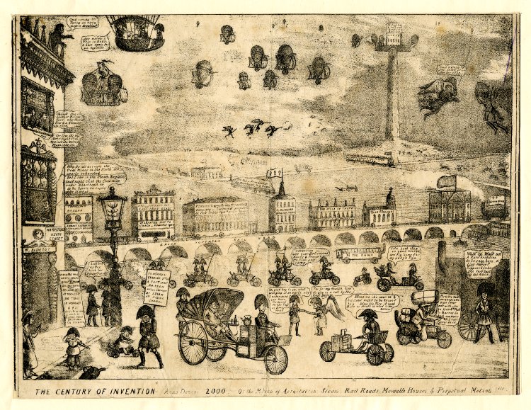 A great example of this high removal is found in "The century of invention Anno Domini 2000 or the march of aerostation, steam, rail roads, movable houses & perpetual motion,” a terrific lithograph, made ca. 1834, the handiwork and imagination of Charles Jameson Grant, a satirist and observer of high order. He tried looking into the future 165 years hence, and in some practicable ways he got a lot of it right--the imagery wasn't there, but the iconic sense of what may come to be was.
