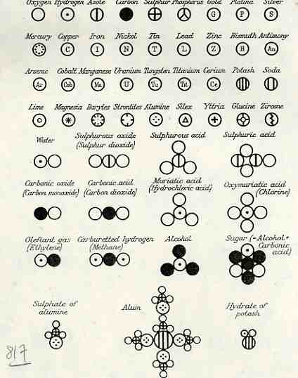 On the other hand the history of the construction of the periodic table is necessarily filled with dots, as we see with the monarchical creation of John Dalton (1766-1844), in his New System of Chemical Philosophy (part II), and which was printed in 1810--these symbols were sued to visually represent the atomic structure of compounds, and were of vast importance and predictive powers, marking the true modernizing of chemistry. It was in Part I of this work that Dalton first applied atomic theory to chemistry.