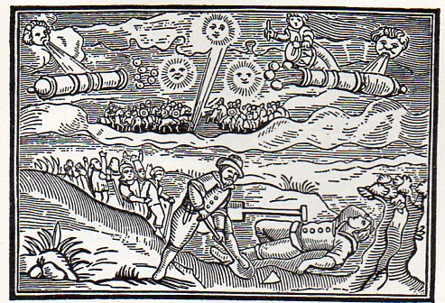 [For some reason the celestial court, divided by sunlight and flanked by two other sources of light, have ofund it expedient to issue comets from the mouths of Heaven Canon. I'm not sure what's going on in the forground with the fellow working his spade next to the triangular blankness. the man to his right seems to have been overtaken in fear (as have the group of people visible to the left over the shoveler's shoulder).]