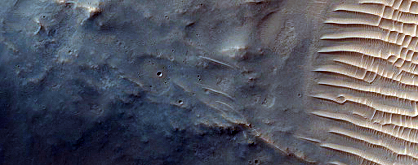 [The seat of the problem for Gruithuisen--the complex structures at left thought by high in observation a low-powered refracting telescope to be streets and buildings. Source: NASA/JPL/University of Arizona, University of Arizona's HiRISE (High Resolution Imaging Science Experiment).]