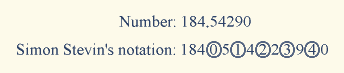 Simon Stevin (1548-1620) introduced the idea of decimal numbers in his 36-page De Thiende ('The Art of Tenths"1) in 1585, an idea that replaced much more cumbersome earlier methods of representation. So, the number 3.14159 would be written in the Stevein notation as (where in this case numbers enclosed by brackets, i.e. "[9]" would have been represented in print as a 9 within a circle) 3[0]1[1]4[2]1[3]5[4]9[5]. It is also seen here: