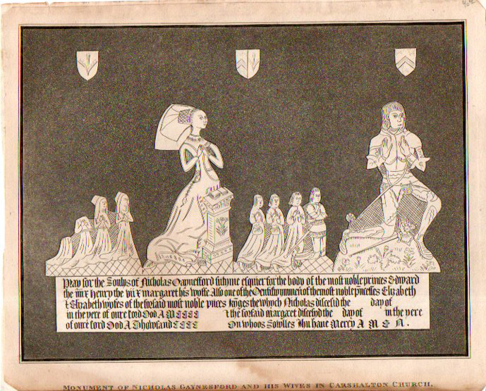 The engraving, "Monument of Nicholas Gaynesford and his Wives in Carshalton1 Church" was published in Lyson's The Environs of London, 1796 (though this may be reprinted just a bit later), and depicts the very large monument to Gaynesford (1471-1548). What is particularly remarkable for me is the incredible stipple work that forms the background. On first glance the background treatment seems to be solid, but there is something else there that gives it a depth and causes the collection of stark white figures to seemingly float on the page. This is the cause: