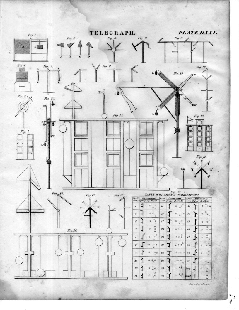 This curious illustration appears in forty-five volume Cyclopedia of Abraham Rees (published 1795-1820), displaying a system for communicating over distances at night. When this part of the Cyclopedia was printed in 1808, the electrical telegraph was still 37 years away from coming into being--45 years from being somewhat well-used. Before this time (visual) communications over long distances at night were limited to just these sorts of means--lighted semaphores, hand-held torches, that sort of thing.