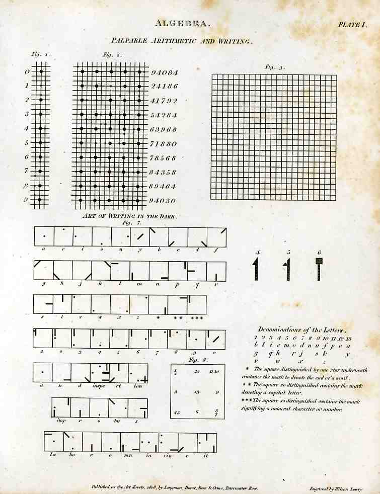 Signaling at sea at night was somewhat different at this time and didn't include anything remotely close to the alphabet. So the rather complex system that we see here (above) is extremely uncommon--it seems also very unwieldy to put into effect. Unfortunately I don't have the text volume that would explain then entire system and implementation, so I'm going to guess that there was a large, powerful light source that was covered by a tight, black, covering tablet that would eliminate nearly all light leakage. The symbols for each letter of the alphabet (and numerals) would be cut out from another tablet that would fit over the face of the light source, placed between the blank and the light. To transmit a letter the user would then simply remove the blank covering tablet to reveal the light broadcast by the hole or slit in the tablet underneath. The blank would then be placed back, a new tablet for a new letter placed underneath, and the process would begin again: blank (dark); letter (light); blank (dark); letter (light), and so on to the end of the message. I guess the distance at which these symbols could be seen would be dependent on light source, atmospheric conditions, ad so on. The way that the letters are made into symbols seems to me very intelligent, so that you distinguish the differences from an appreciable distance. I like it--its an elegant idea. (Well, maybe it didn't work in this manner, but it seems to make sense to me.)