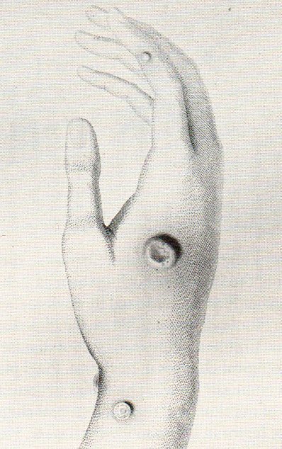 4. Described by Jenner so: “On the seventh day he complained of uneasiness in the axilla, and on the ninth he became a little chilly, lost his appetite, and had a slight head-ache....." but on the 10th day he was perfectly well.... In order to ascertain whether the boy, after feeling so slight an affection of the system from Cow-pox virus, was secure from the contagion of the Small-pox, he was inoculated the 1st of July following with variolous matter (Small-pox matter, ed.) immediately taken from a pustule......No disease followed.... Several months afterwards, he was again inoculated with variolous matter, but no sensible effect was produced on the constitution."