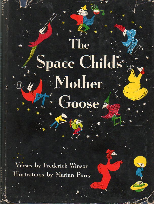 The physics-esque approach to the old idea rests in the verses of Frederick Winsor in his The Space Child's Mother Goose, printed by Simon and Schuster in 1958, the stories helped along by some fine and tech-intricate drawings by Marian Parry. The poems are occasionally delightful as works in themselves; but when you grade the work on a curve of science poems/funny science, it gets an even higher grade. Let's face it--there weren't that many works in this genre in the 1950's/'60's, so it gets a little help just for being a friend to the lonesome in the pop-science-poem arena. (The text for the volume can be found here; and if you wanted to own it you may purchase it from our blog bookstore, here.)