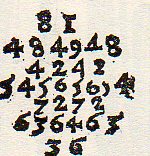 That was sort of a simple introduction to magic squares, tortured by my note on the quote's parentage. Nevertheless, leafing through a copy of Ozanam's work I found a lovely little (literally speaking, as it is about 1/2 inch by an inch) 3x3 multiplication magic square for the happy sequence of 1, 2, 4 ,8, 16, 32, 64 and 256. (That means that each of the nine numbers may appear only once, and that the product (4096) must be the same for each column and row). It is a nice little problem, and I was just surprised to see it in such spare simplicity.
