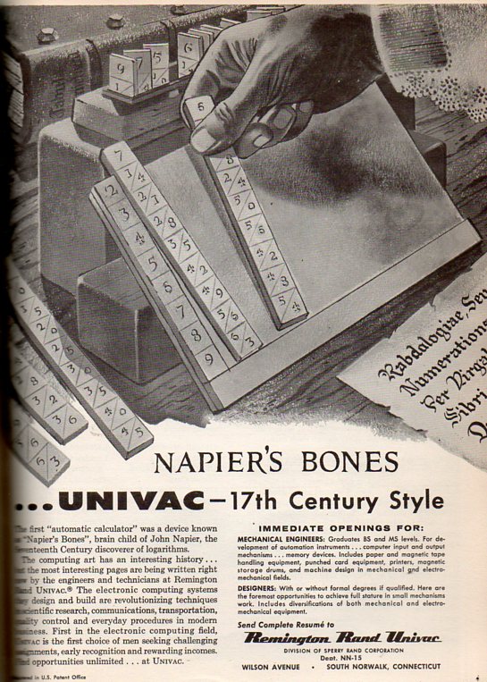 Well, probably. The ad is by UNIVAC—fives years old at this point—and the lace-cuffed image pushing the virtues of the world's first commercial computer is that of John Napier's abacus, which he wrote about in 1617. The ivory calculating bones/rods method had been seen before in the history of the maths and calculation, but not published, and the idea employed in the elegant calculating device were very old, but Napier seems to have gotten to publish it first. (His work on logarithms is of tremendous importance, far more so than the abacus.)