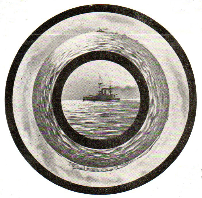 This interesting and arresting images appears in Scientific American Supplement, October 23, 1915 (page 269). It is an excellent view of topside from 30' or so below. The article describes simple, compound, tele-objective, direct-reflected, panoramic, and periscopes with annular fields--sort of simple, but not really. In any event the panoramic periscope gave a view of a directed point-of-view as well as a slender (but versatile) 360o.